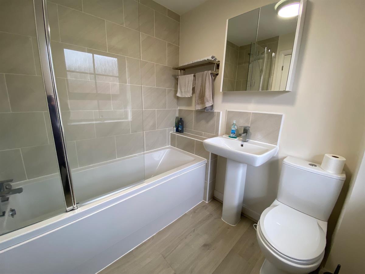 Family bathroom with uPvc double glazed Georgian bar frosted panelled window to the rear elevation, double panelled radiator, laminate flooring. The bathroom is fitted with a three piece suite comprising of a push button low level WC, pedestal wash hand basin with mixer tap and complimentary splash back tiling, panelled bath with mixer tap and mixer shower over with a glazed shower screen, complimentary wall tiling, wall mounted extractor fan.