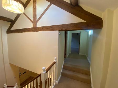 Sweeping staircase leading to the first floor with an array of huge beams to the walls and ceiling, further stairs to either side of the landing lead to all bedrooms and family bathroom. Velux style roof light.