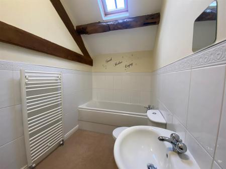 Family bathroom with built in airing cupboard. Part tiled walls, extractor fan and heated ladder towel rail. Fitted with a Velux style window to ceiling, beamed ceiling. Panelled bath with mixer tap over, low level, push button W.C., pedestal wash hand basin, shaver point.