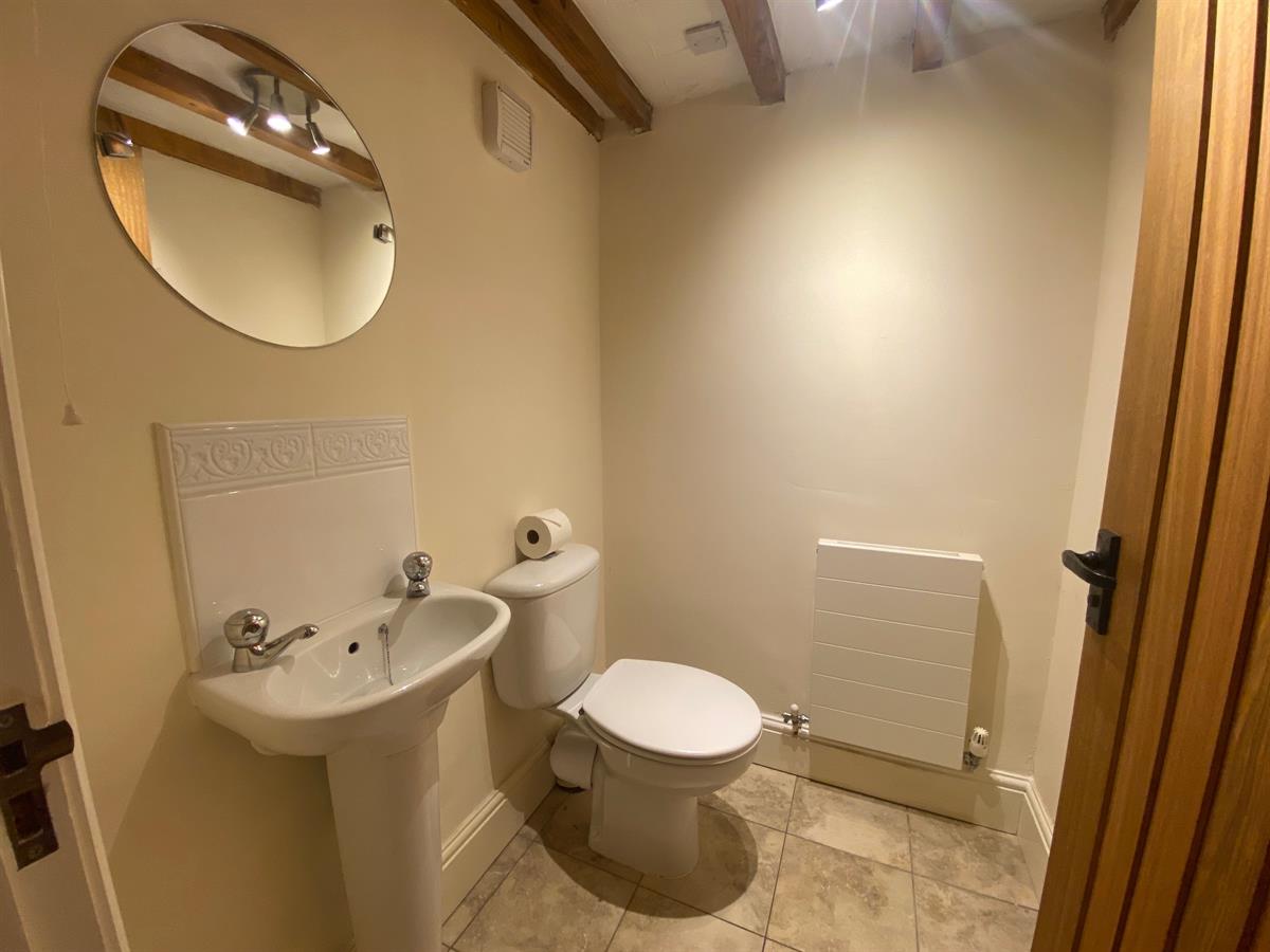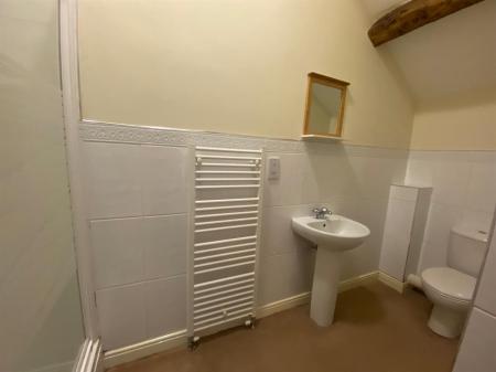 Fitted with a 3 piece suite comprising walk in shower cubicle with electric shower, low level, push button W.C., pedestal wash hand basin with mixer tap. extractor fan, beamed ceiling, heated ladder towel rail, shaver point and part tiled walls.