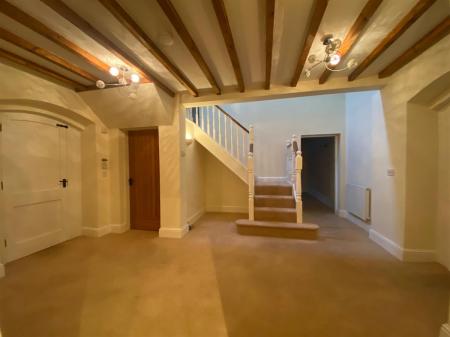 Spacious reception hall boasting a magnificent sweeping staircase rising to the first floor split landing. A wealth of rustic charm is provided by wooden doors and beamed ceilings. Rear door leading onto the shared block paved courtyard. Boiler cupboard housing wall mounted central heating boiler. Flat panel radiators.