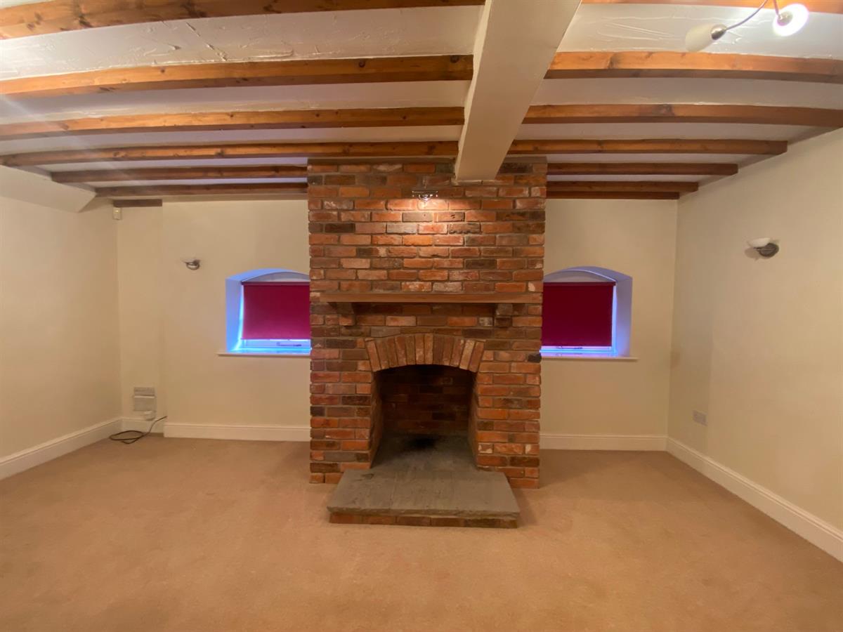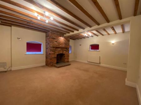 Generous sitting room with stunning feature brick fireplace with wooden mantel and slate hearth and beamed ceiling, wooden windows, two modern flat panelled radiators.