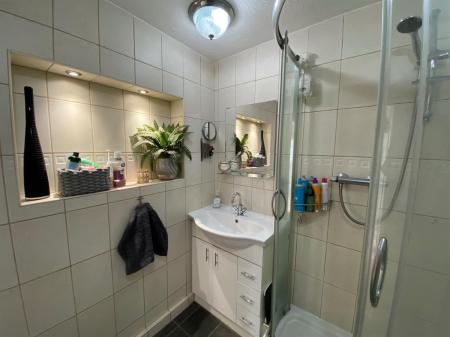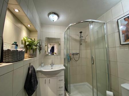 Fitted with a 3 piece suite comprising corner shower with glazed sliding doors, low level, push button W.C., vanity unit wash hand basin with mixer tap over and cupboard and drawers below, wall mounted chrome heated ladder towel rail. Ceiling heater. Tiled walls.