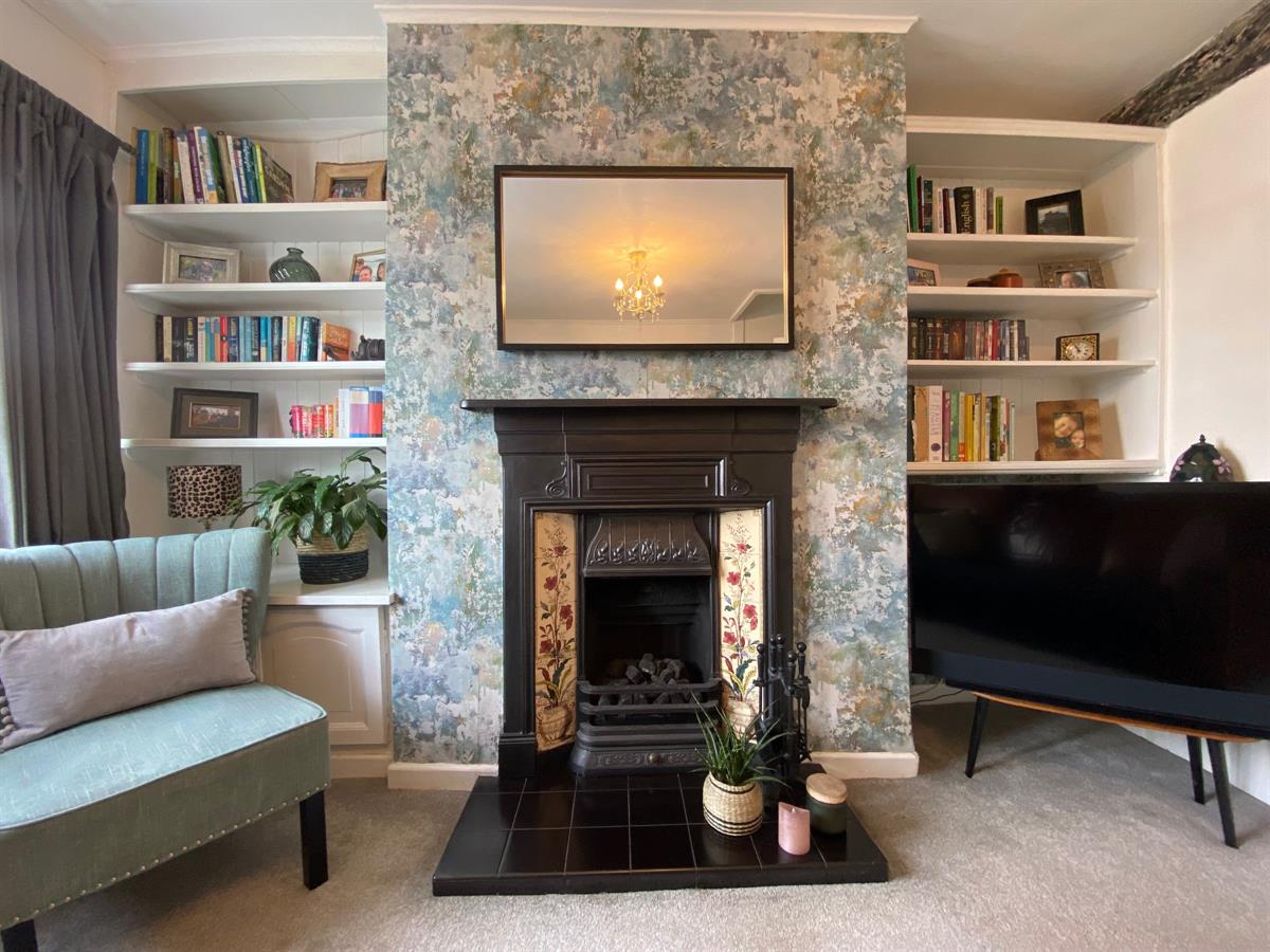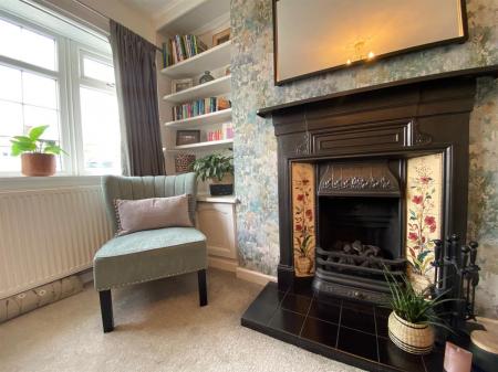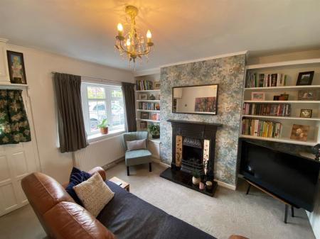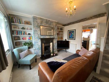 Good sized sitting room having feature ornate fireplace with tiled slips and hearth housing a gas fire. Exposed beam. Shelving to either side of chimney breast. uPvc double glazed window to front elevation. Radiator. Stairs rising to first floor and glazed panelled door through to: