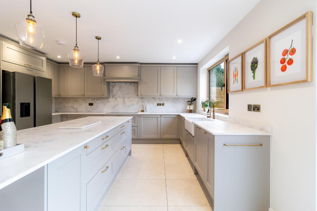 The bespoke kitchen features an extensive range of cabinetry incorporating a dedicated coffee station, Neff Slide & Hide oven, separate microwave/steam oven, AEG five-ring induction hob with extractor, Shaws oversized Butler's sink with Quooker tap, and integrated dishwasher. Matte marble-effect quartz worktops add a luxurious finish, while the substantial central island is illuminated by statement Cotswold Company pendant lighting creating a natural gathering point for family and guests alike.