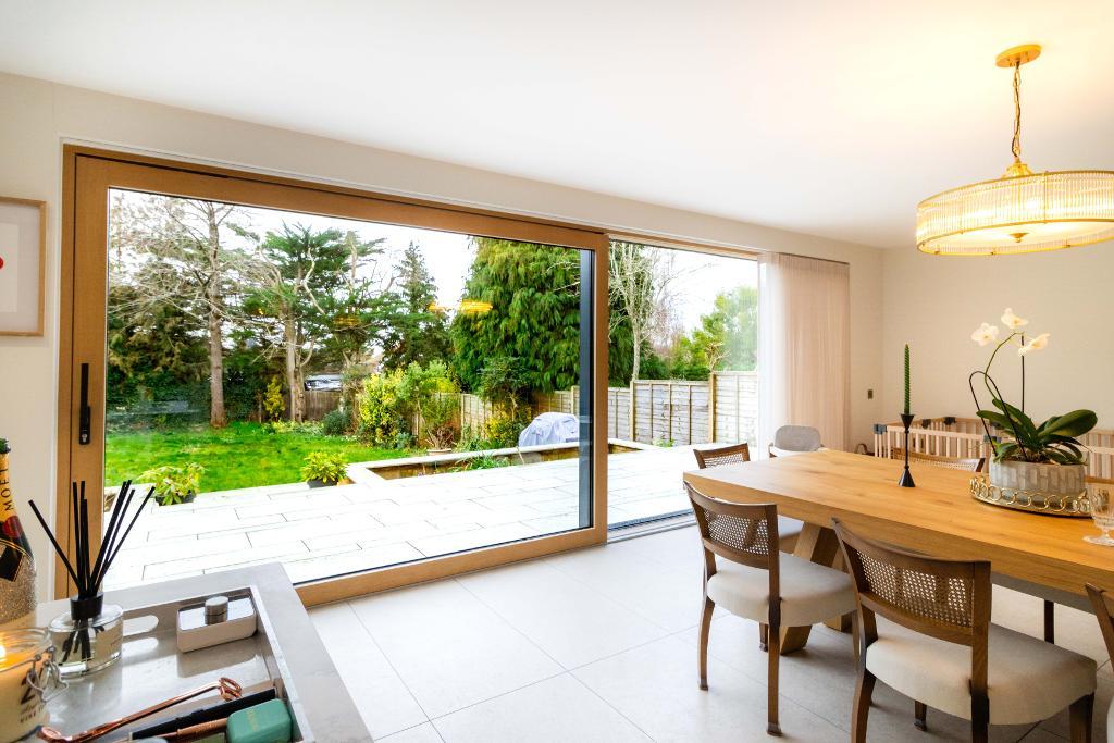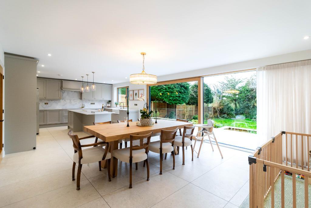 Pocket hide-and-slide doors reveal the showpiece of the home: a magnificent open-plan kitchen, dining and family space, forming part of a high-specification extension completed within the past five years. Designed as the ultimate setting for both everyday living and stylish entertaining, this space is nothing short of spectacular.
