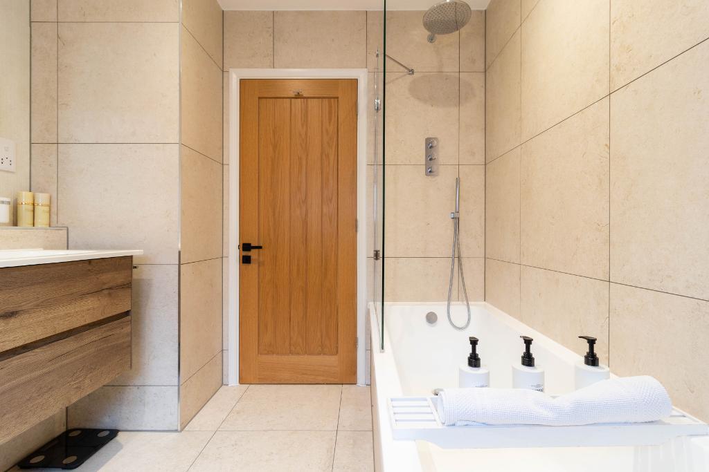 Upstairs, a bright and architecturally interesting landing with vaulted ceiling, Velux window and linen storage leads to four beautifully proportioned double bedrooms. The principal suite is a sanctuary, featuring fitted wardrobes, a dedicated dressing room concealed behind a pocket sliding door, and a luxurious en-suite shower room finished to an impeccable standard, showcasing Parker & Howley free-standing his-and-hers Vitra basins and elegant Pooky lighting.