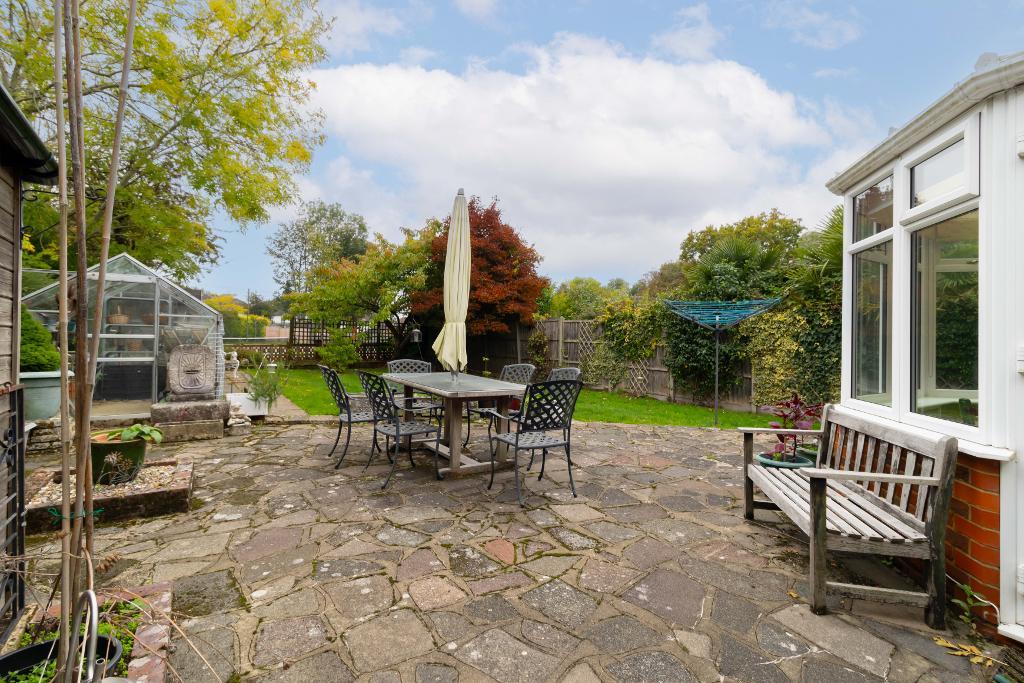 The rear garden is level with a patio and several seating areas. The garden backs onto the Sanderstead Lawn Tennis Club, enjoying a pleasant outlook.