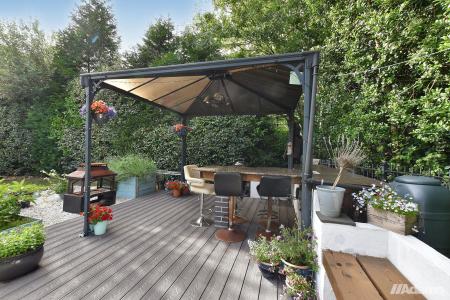 Outside, the property boasts two landscaped side gardens: one with a sunny patio area, perfect for summer dining, and the other featuring a decked area with a gazebo, ideal for relaxing or entertaining. A private garage and driveway to the rear adds secure parking and additional storage.