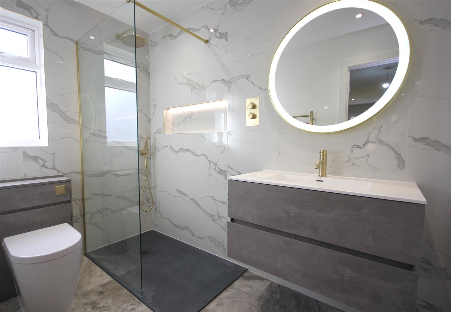 Beautiful modern en-suite shower room comprising three piece white suite enjoying low profile walk in shower, marble effect wall/floor tiling & gold chrome finishings
