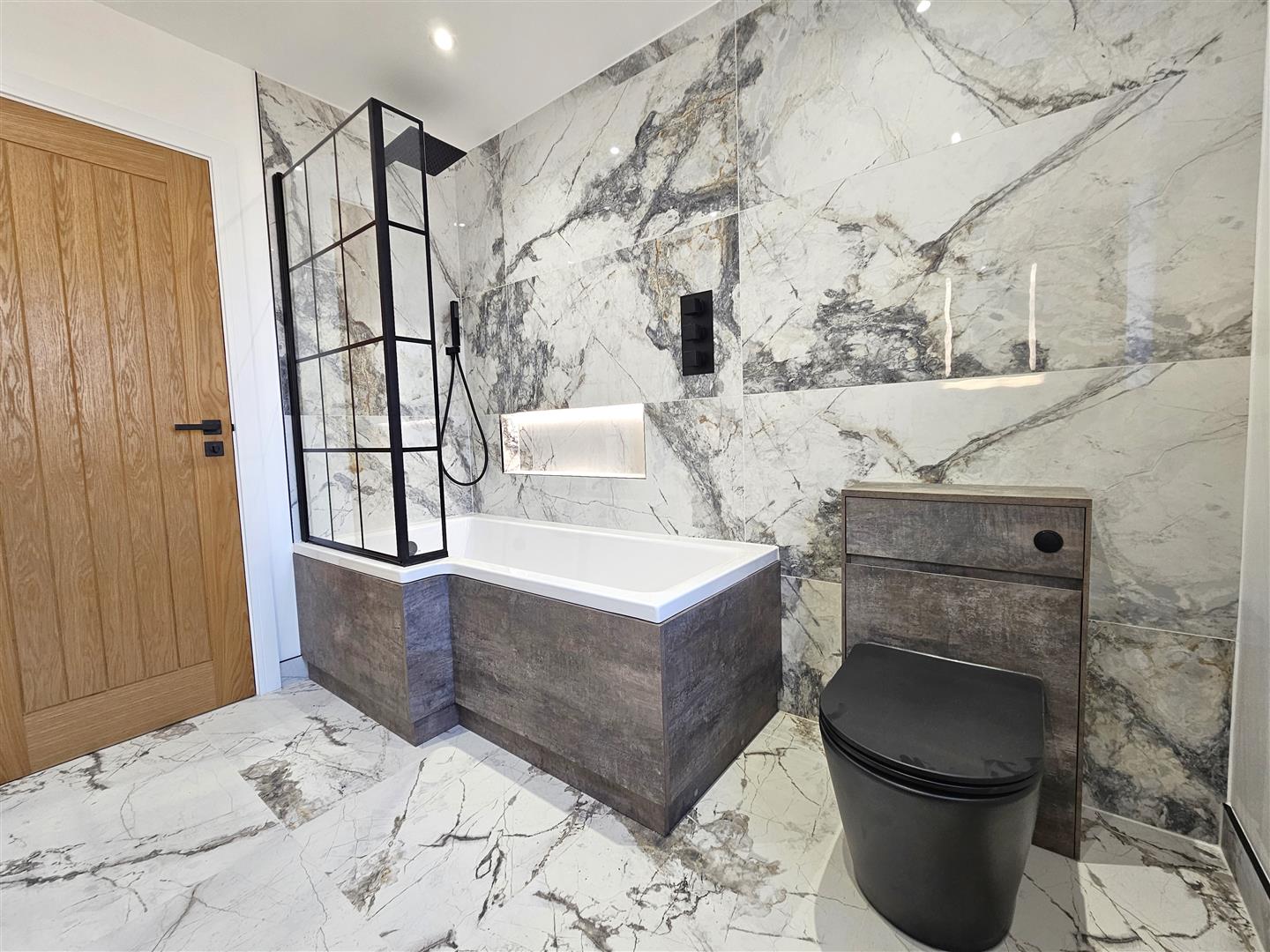 Modern main bathroom comprising three piece white suite & attractive marble effect wall/floor tiling