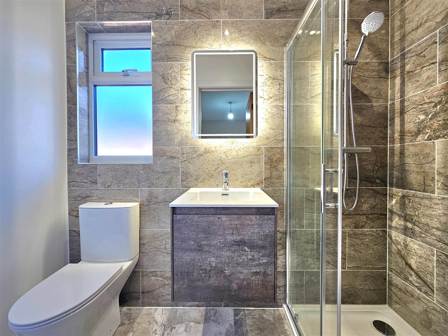Modern en-suite shower room comprising three piece white suite & attractive marble effect wall/floor tiling