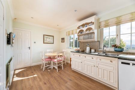 The ground floor flows from a welcoming entrance hall into a bright sitting room with adjoining sunroom, enjoying uninterrupted views of the surrounding landscape. The shaker-style kitchen is beautifully appointed with a single oven (with integrated microwave above) and plentiful storage, while the dining space creates a natural hub for everyday living. Two ground-floor double bedrooms, a house bathroom and guest cloakroom add convenience and versatility, ideal for family life or single-level living.