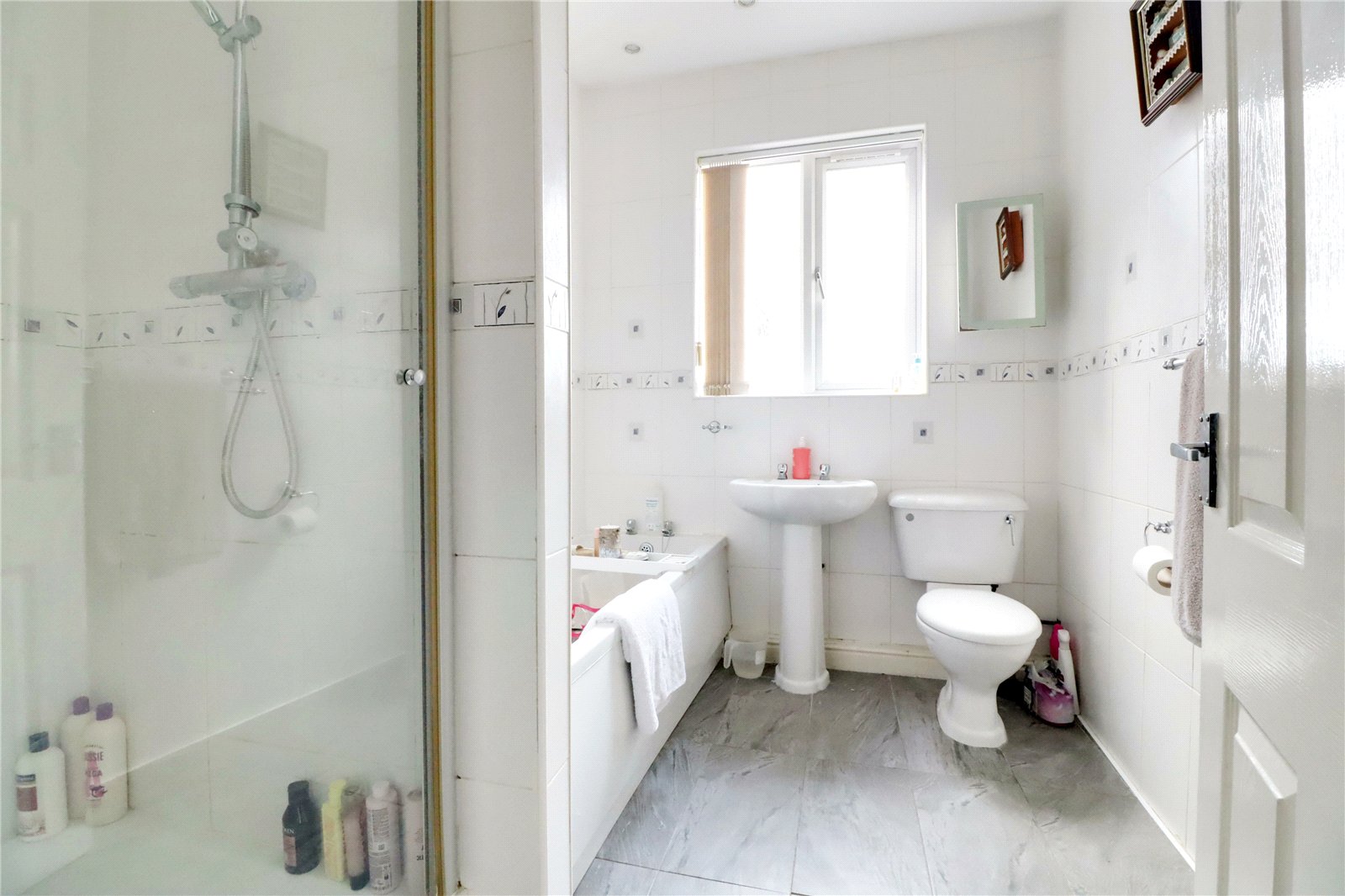 Family Bathroom 8'6" x 6'9" (2.6m x 2.06m). With side uPVC double glazed window with patterned glazing providing a four piece suite in white comprising a low flush WC, pedestal wash hand basin, panelled bath, seperate shower cubicle with overhead main shower, tiled flooring, fully tiled walls and inset LED spotlights.