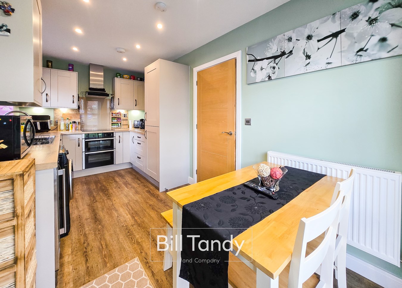 4.90m x 2.40m (16' 1" x 7' 10") having a feature double glazed picture window to front, additional double glazed window to side, spotlighting, radiator, LVT floor, a range of Cashmere Shaker style base cupboards and drawers with round edge work tops above, wall mounted cupboards with under-cupboard lighting, inset stainless steel one and a half bowl sink, inset Neff oven and grill with four ring electric hob and extractor fan above, integrated fridge/freezer and dishwasher, space ideal for washing machine and wine cooler.