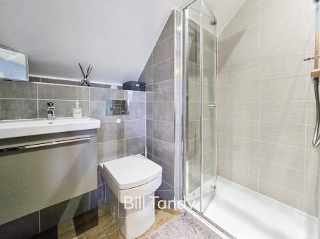 1.98m x 1.64m (6' 6" x 5' 5") having an LVT floor, chrome heated towel rail, modern white suite comprising wall mounted vanity unit with inset wash hand basin, low flush W.C. and shower cubicle with twin-headed shower appliance over and ceiling spotlighting.