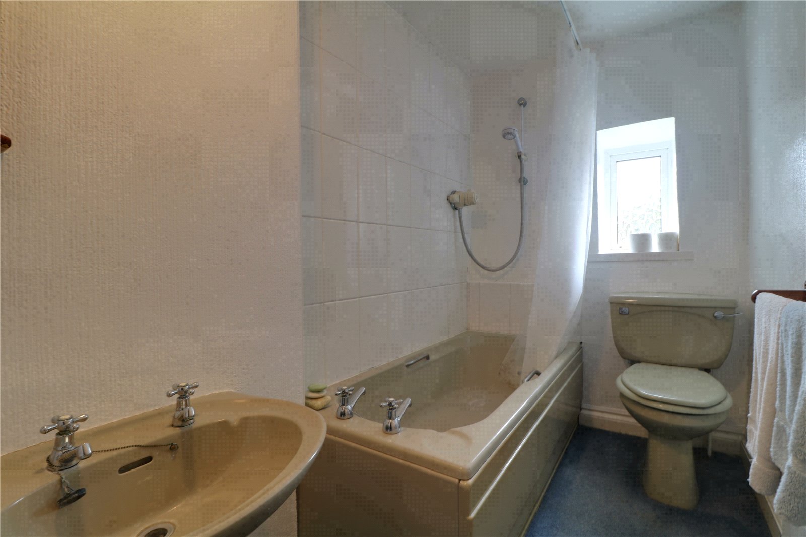 Bathroom 4'7" x 8'2" (1.4m x 2.5m). With a rear uPVC double glazed window with frosted glazing and a three piece suite comprising of a pedestal wash hand basin, panelled bath and a low flush WC and loft access.