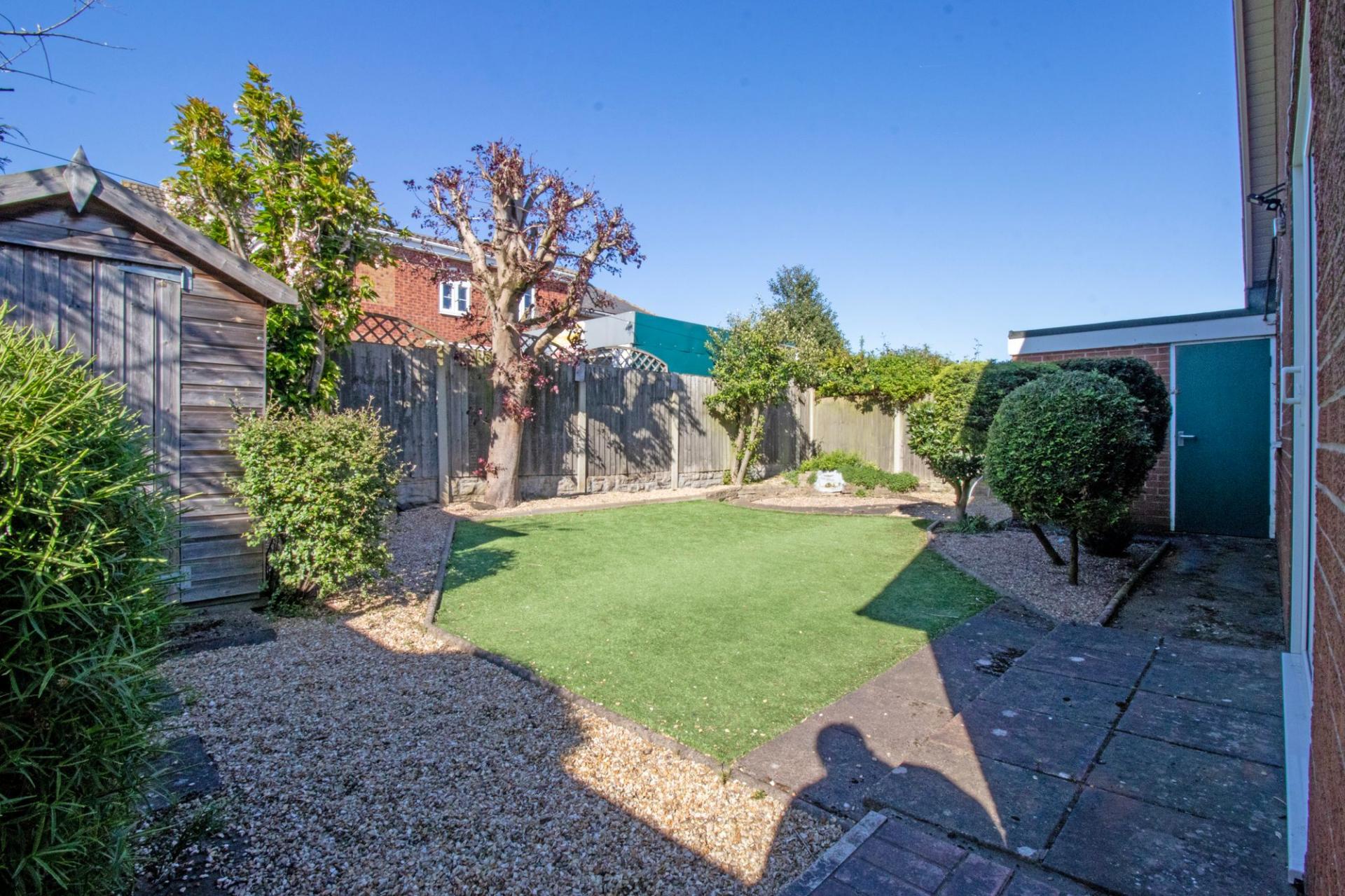 To the rear, the property boasts a particularly generous and well-maintained garden, designed with ease of upkeep in mind. Predominantly laid to artificial lawn, it also features a pebbled entertaining area and a paved seating space—ideal for outdoor dining and socialising—along with a useful storage shed.