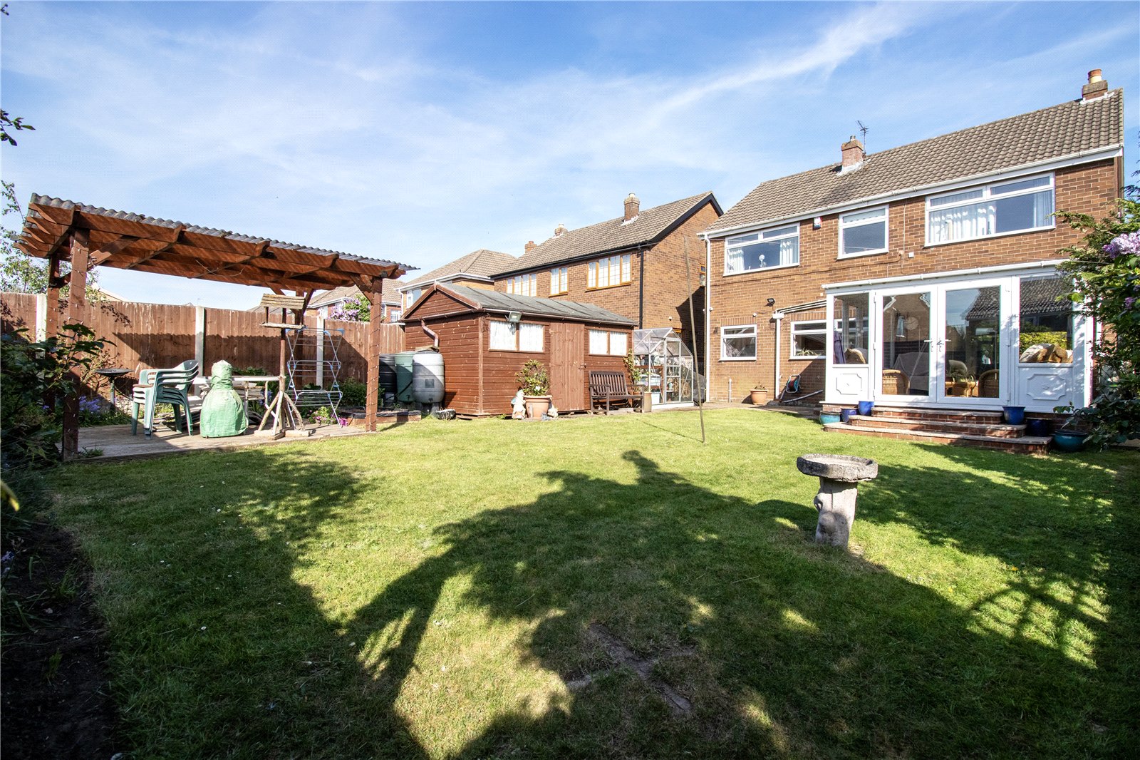 Externally, the property benefits from a generous block-paved driveway providing ample off-road parking and access to the integral garage. The front garden is mainly laid to lawn, complemented by mature trees and shrubs. To the rear, a substantial enclosed garden offers plenty of outdoor space, featuring a lawn, a wood-decked entertaining area, a useful storage shed, and a greenhouse.
