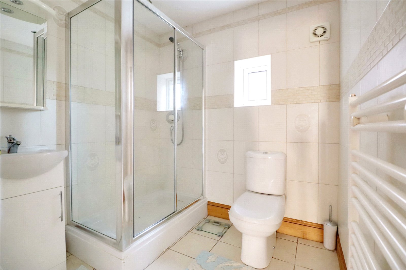 En-Suite Shower Room 6'9" x 6'3" (2.06m x 1.9m). With side uPVC double glazed window with patterned glazing, modern suite in white comprising low flush WC, wash hand basin with storage beneath and mirror above with downlighting, double shower cubicle with mains shower and glazed screen, tiled floor, fully tiled walls and a fitted towel rail.