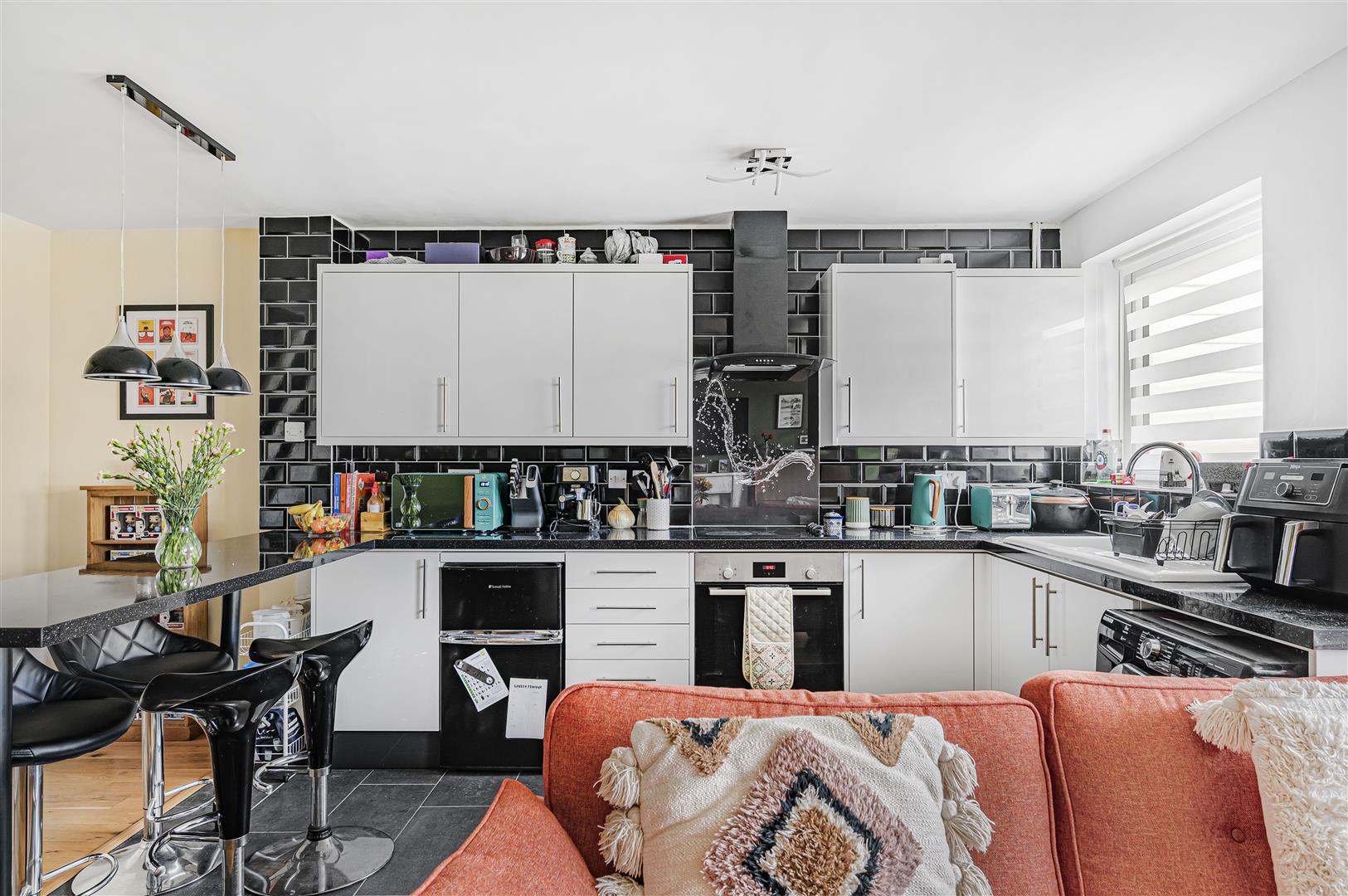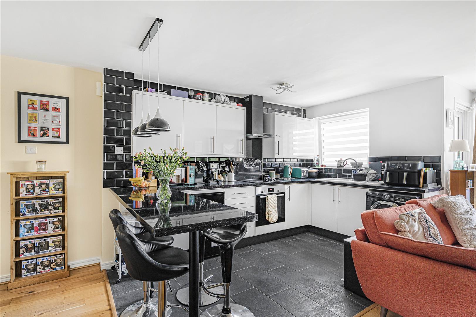 Kitchen - A well appointed open plan modern kitchen with matching wall and base units. Work surfaces with integrated electric hob with oven under and extractor above. Inset sink and drainer unit. Space for washing machine and further space for under counter fridge. Nest of drawers, tiled splashbacks, slate effect floor and breakfast bar. Double glazed window.