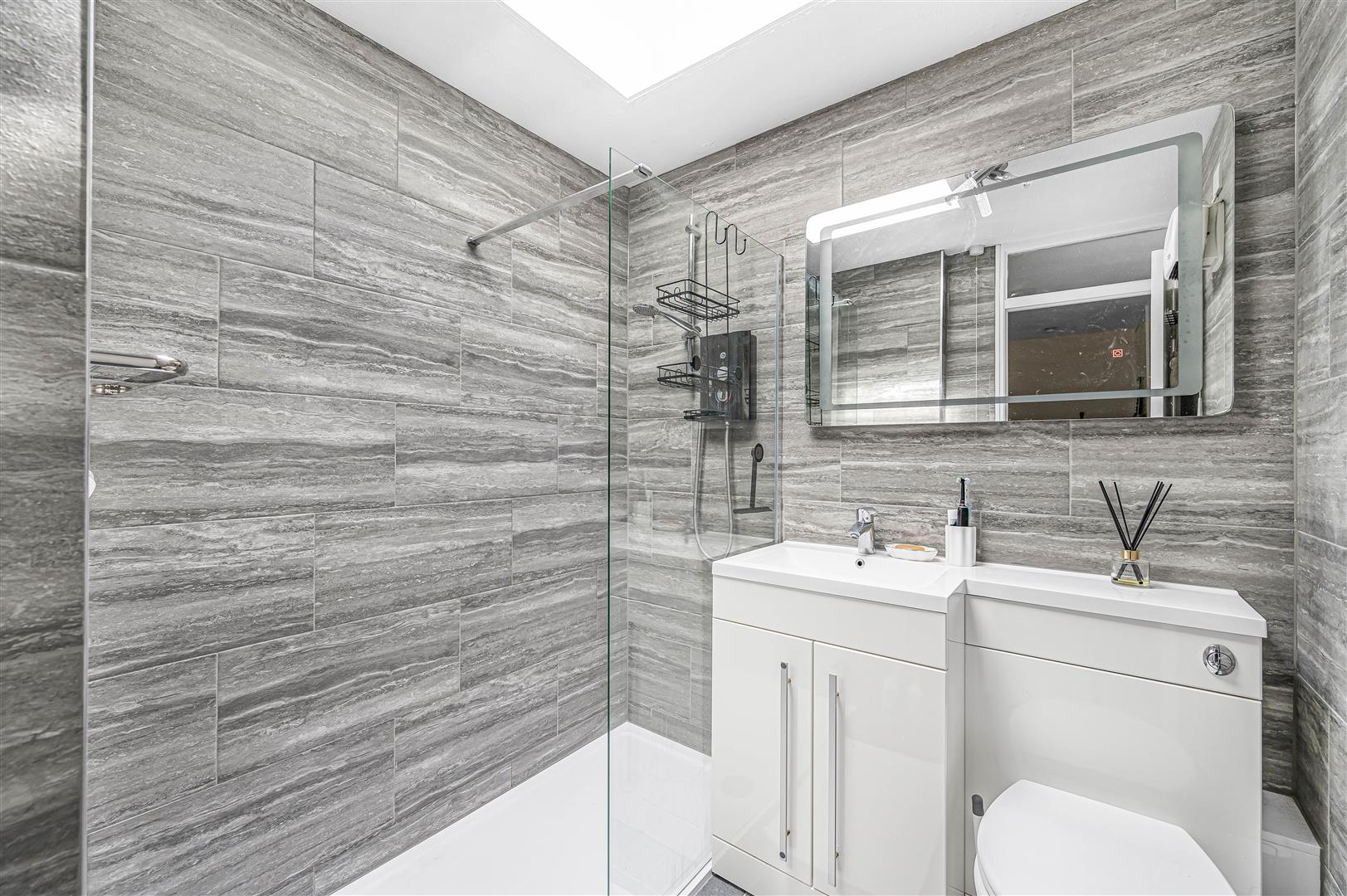 Shower Room - Suite to comprise double shower with glass screen and electric shower unit. Wash hand basin inset vanity unit. Low level W.C. Stone effect tiled walls. Sky light.