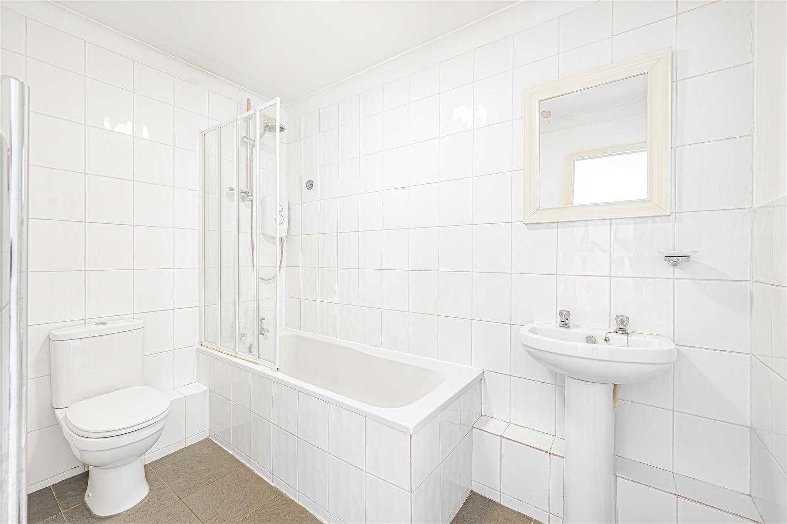 Bathroom - Suite to comprise panel enclosed bath with electric shower and glass screen, Low level W.C., pedestal wash basin, chrome heated towel rail, tiled walls and extractor fan.