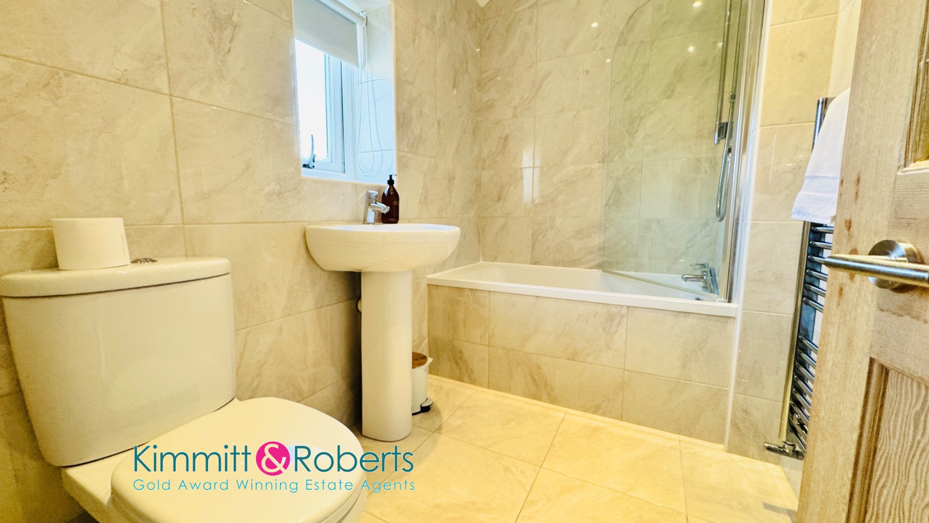 Bathroom fully tiled with panel bath with shower over and glazed screen, w.c., sink unit, heated towel rail, w.c. and double glazed window