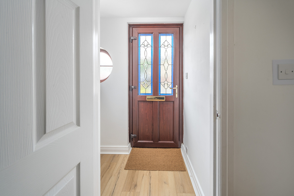 Entry is via the front door which opens into an internal porch which houses an upgraded metal consumer unit for ease of access and offers convenient cloaks and shoe storage. A lovely round window overlooks the front of the property and illuminates the wood look flooring which extends into the lounge-kitchen-diner creating a continuity between the different spaces.