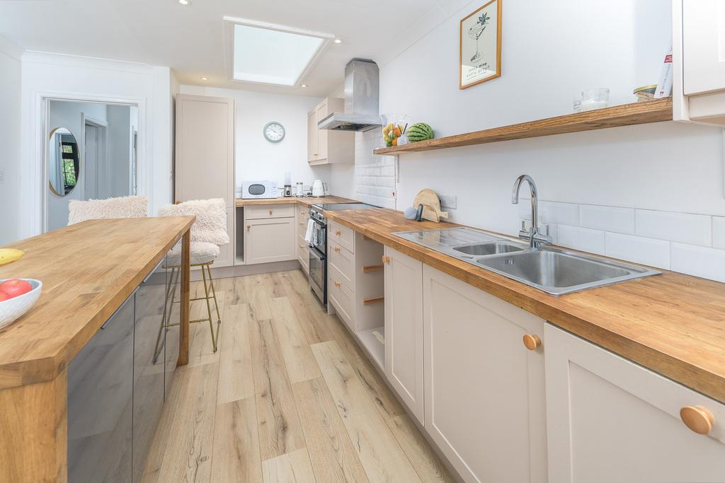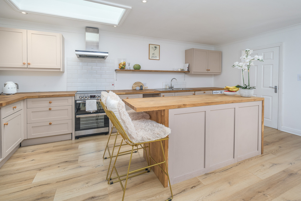 Showcasing a beautiful bay window and another arched window, the lounge-kitchen -diner is superbly light and bright: a lovely open plan space in which to spend time with family and friends. The kitchen offers a good number of wall and base units complemented by a solid wood work surface and brick style splash back tiling. There is space for a free-standing cooker beneath a chimney style extractor fan, a bowl and a half stainless steel sink, a fully integrated full-sized dishwasher, an integrated fridge-freezer and plumbing and space for a washing machine. The centre island offers further work surface and storage in addition to a breakfast bar area. There is plenty of space for a sofa on which you can relax and watch television or enjoy views over the rear garden.