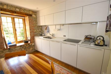 woodland opposite with a brick deep open feature fireplace and exposed stone walls to the rear. A large arch opens through to the kitchen and dining space which has a large window to the