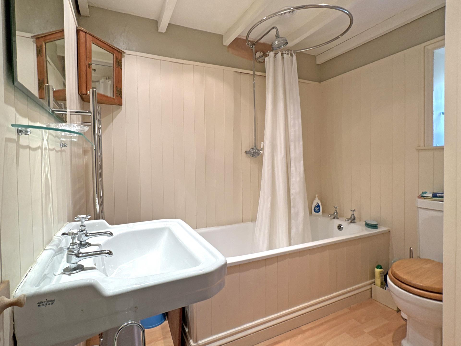 On the first floor there is loft access via a pull-down ladder. The main bedroom has a front facing window, recess for a wardrobe and features a sealed, cast iron, period fireplace. The second, single bedroom looks to the rear and the bathroom has a white suite with a shower over the bath.
