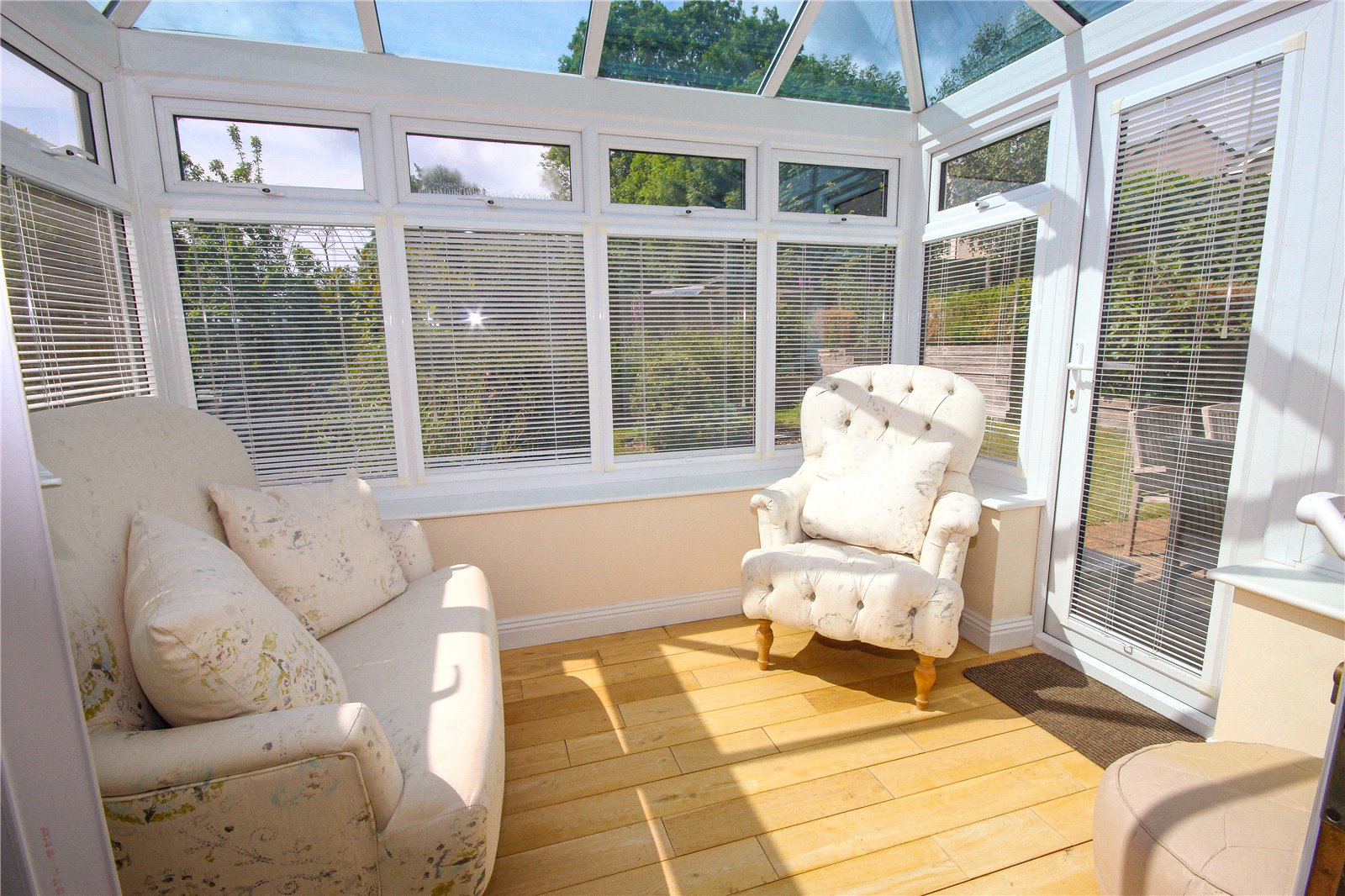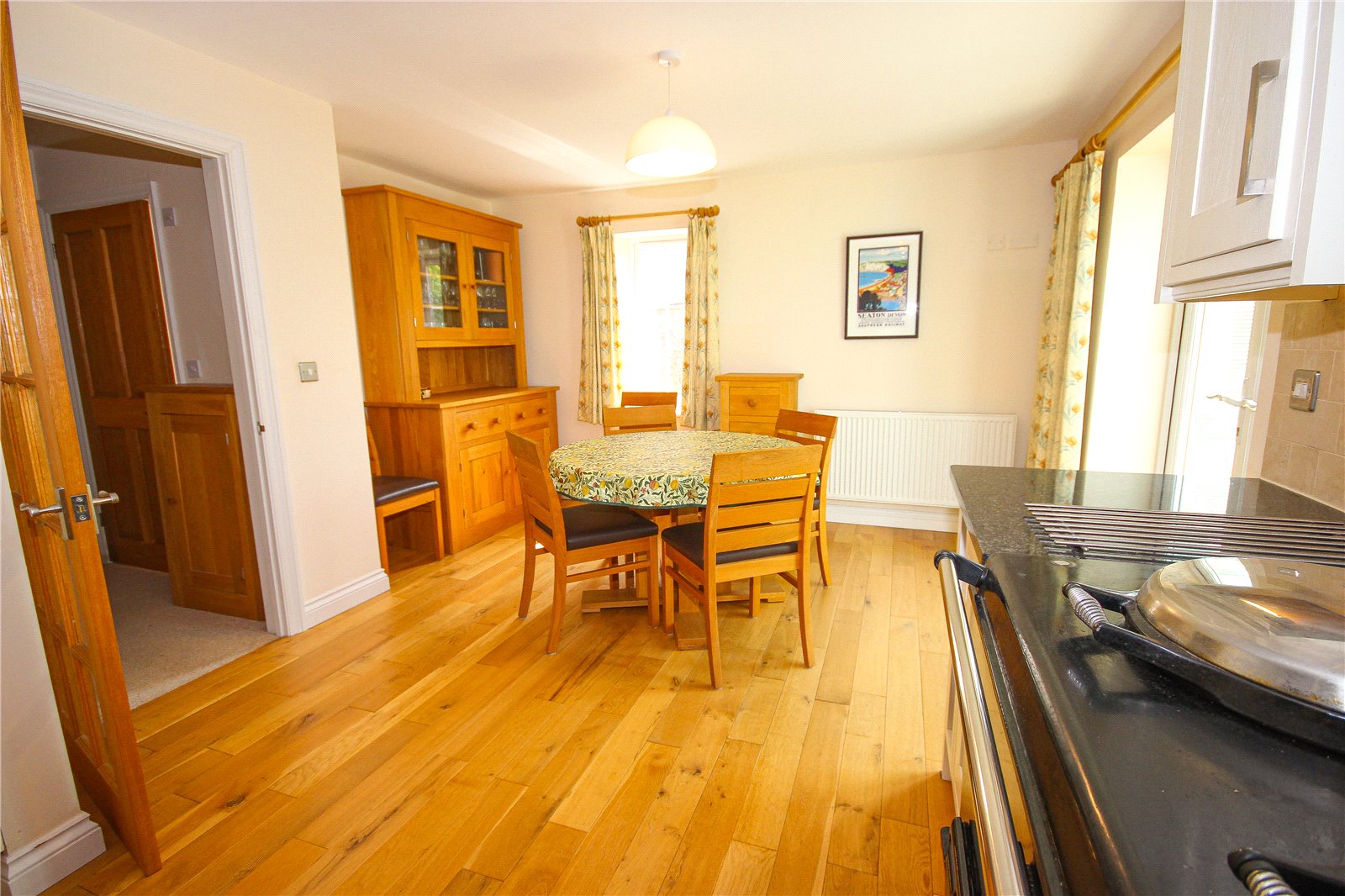 A door to the left opens to a good-sized triple aspect living room with wood burner set on a slate hearth and bay window to front and windows to both sides. From the entrance hall, two separate doors give access to the open plan kitchen/dining room. This sizeable through room comprises a kitchen area to one end and a dining area with ample room for table and chairs at the other end. The kitchen is comprehensively fitted with a matching range of cream, base and wall units with granite worktops, sink, double oven Aga with twin hot plates, integrated fridge freezer, built-in electric oven with gas hob and extractor above and an integrated dishwasher. Wooden flooring flows through the entire room and into the conservatory which is accessed via