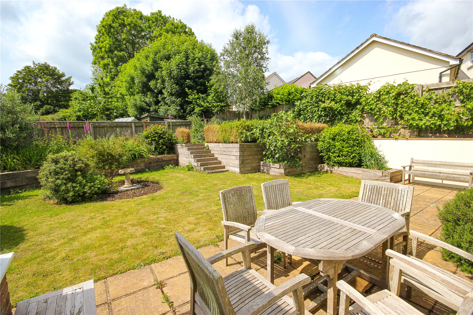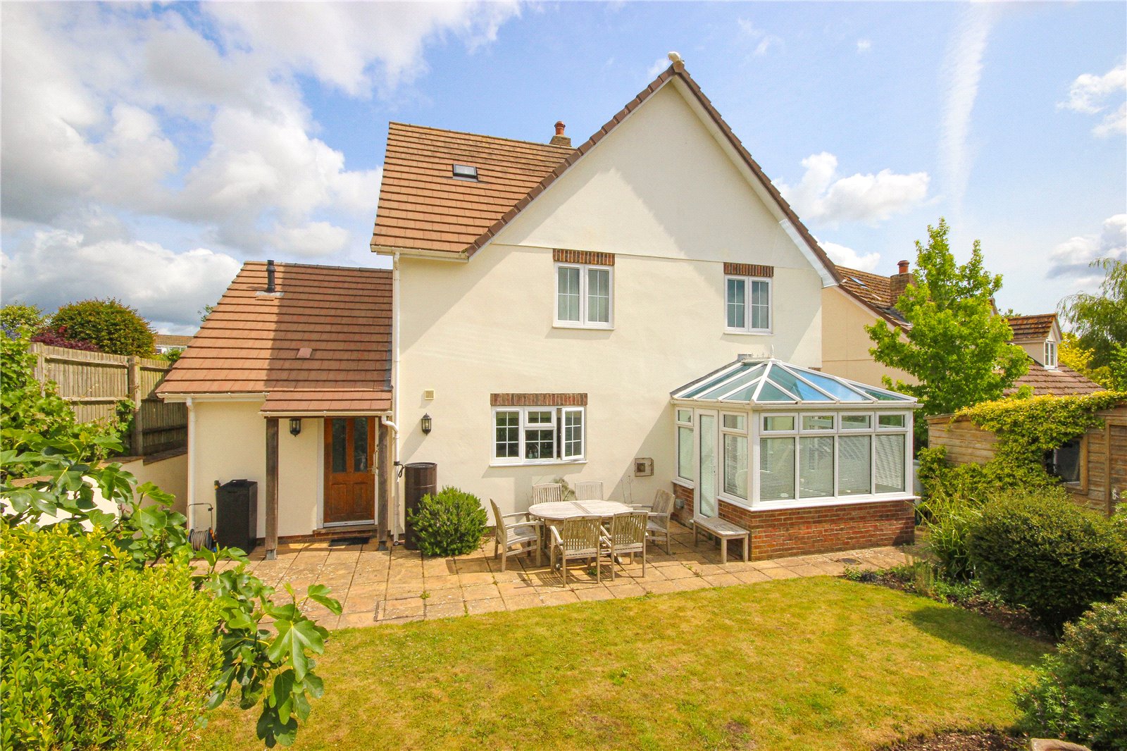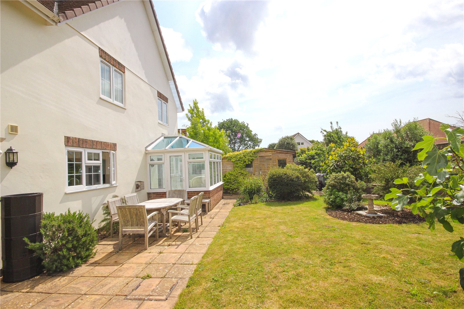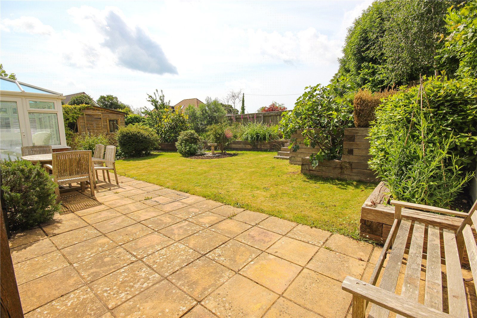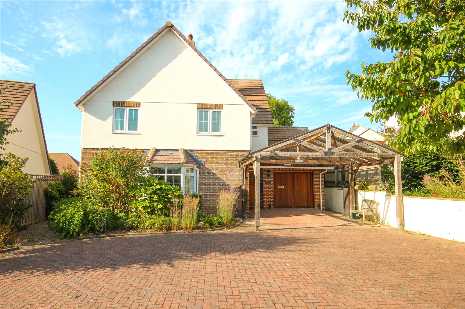 The property is approached over a brick paved driveway past one neighbouring property. There is an attractive wooden carport in front of the attached garage, and to the front of the house there is an abundance of flowering shrubs and plants creating a pretty frontage. A pathway leads around the front of the property then to one side which is fully paved and suitable for boat or trailer storage, with a wood store and large garden shed beyond. This then opens directly into the rear garden with a good sized seating area adjacent to the conservatory and kitchen. Beyond the seating area is a lawn with flower and shrub borders and raised garden areas to side and rear with wooden railway sleepers rising up to an area with raised vegetable beds.
