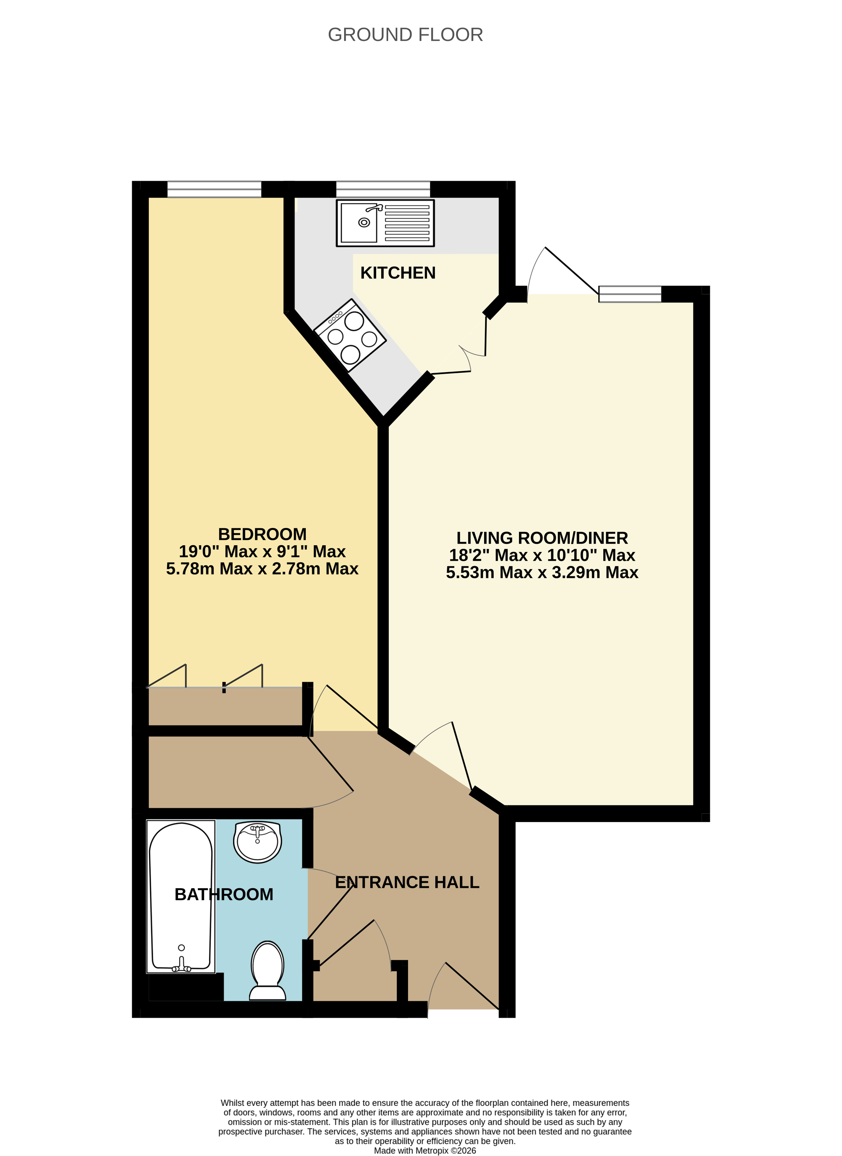 The kitchen is fully fitted with a range of matching base and wall units, laminate worktops and sink, alognside integrated undercounter fridge and freezer, fitted oven and hob.