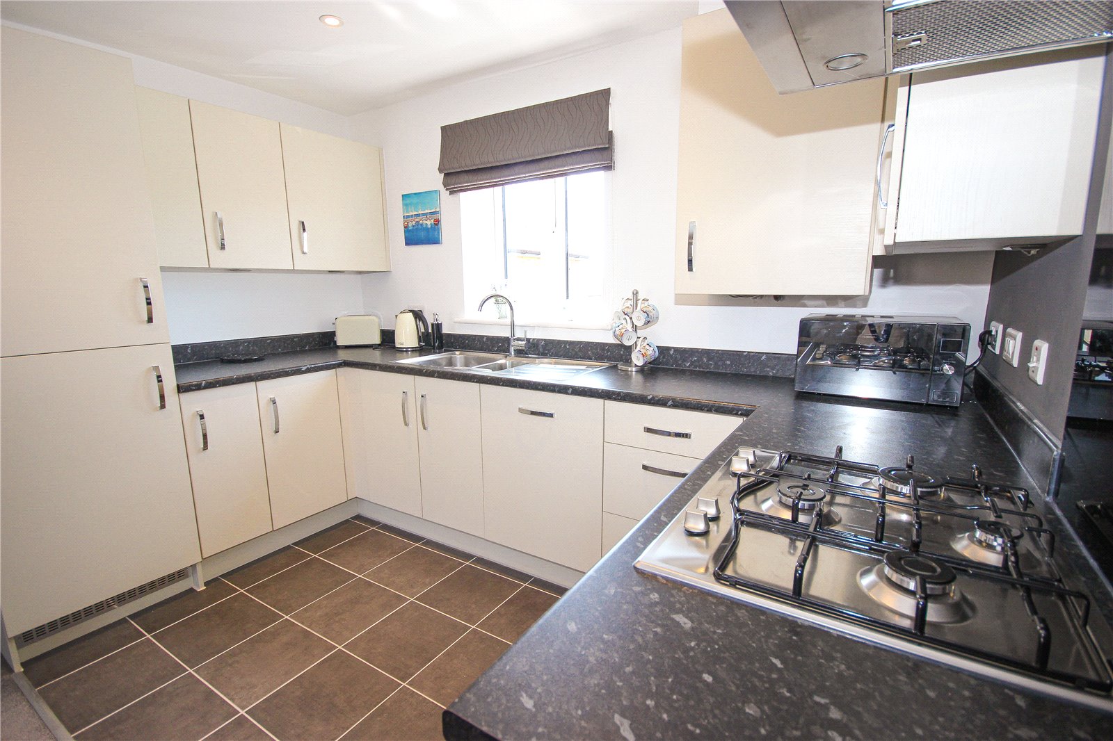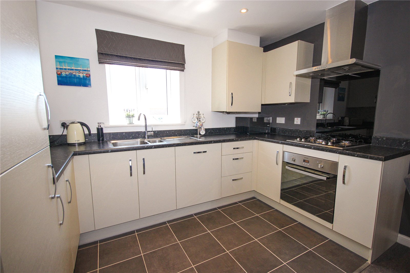 The open plan living space incorporates a modern kitchen to one end with tiled floor, cream base and wall units, integral sink and laminate worktops. There is a built-in fridge freezer, oven with gas hob and extractor and dishwasher. The gas central heating boiler is also situated in the kitchen.