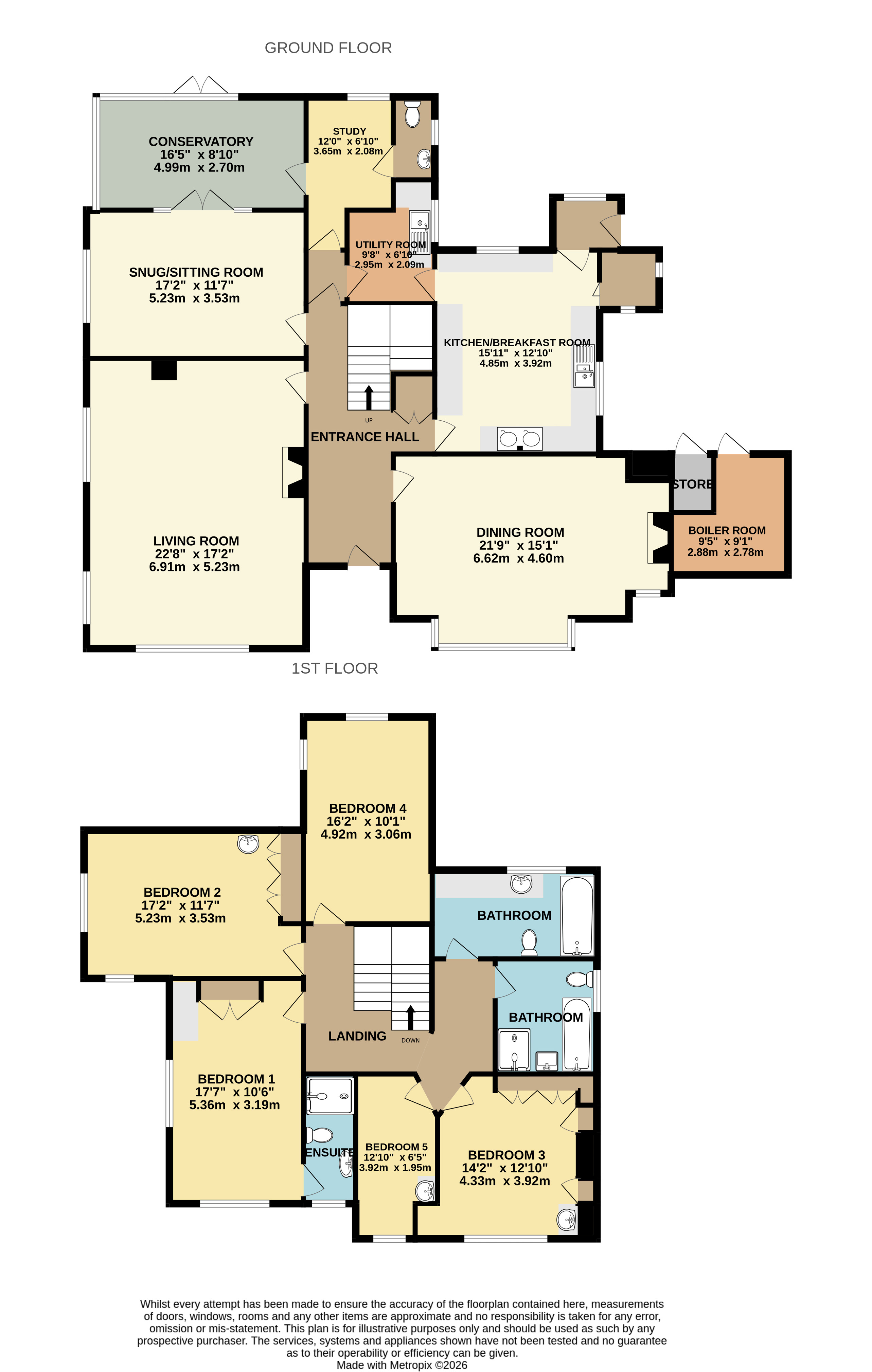 In addition, there are two full-sized family bathrooms, both extremely spacious, one with WC, bath, wash basin and shower, and the other with WC, deep bath, shower and an abundance of useful storage cupboards.