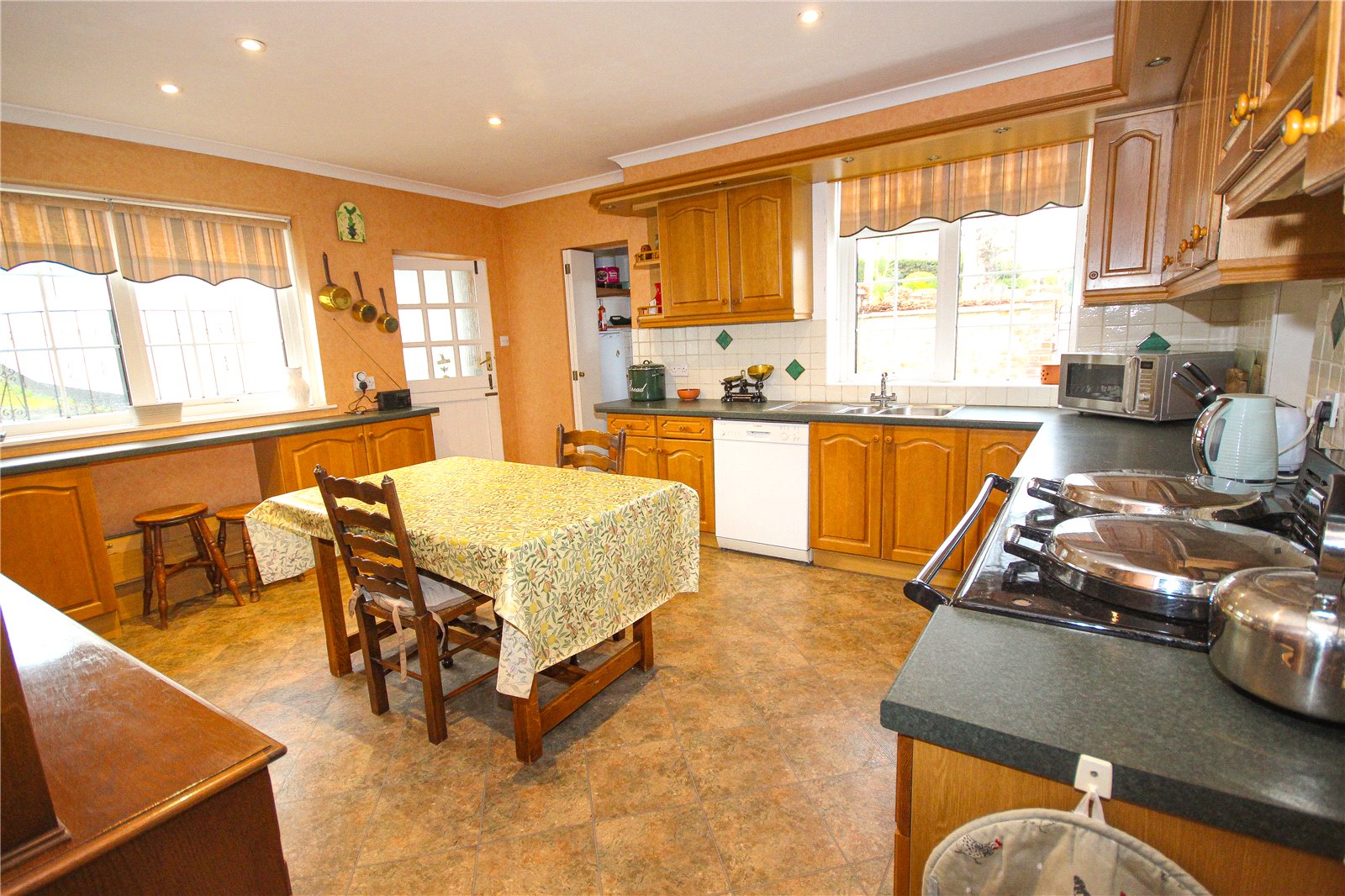 On the opposite side of the hall is a further substantial reception room, showcasing its original parquet flooring, a large bay window overlooking the Estuary, and a handsome stone fireplace with alcoves and glazed cupboards either side, complemented by picture railing and mock ceiling beams. There is also a generous snug/sitting room fitted with bookshelves, a large window overlooking the side gardens, and a door opening into the conservatory, which has French doors leading directly onto the paved terrace with views across the extensive gardens. From the main hallway, a further door opens into a rear study which also has access to the conservatory. This room currently accommodates the lift that services the first floor and leads to the downstairs cloakroom/WC. The sizable kitchen is comprehensively fitted with a matching range of base and wall units and includes a 'British racing-green' coloured double oven gas AGA with twin hot plates, built-in sink, dishwasher and tile-effect flooring. This is a double-aspect room which has direct access to a spacious walk-in pantry/store. A stable door leads to a rear porchway providing access to the exterior. A separate utility room, originally used as the maid's pantry, includes a sink, worktops, original cupboards and glazed cabinets along with space and plumbing for laundry appliances, all set over quarry-tiled flooring.