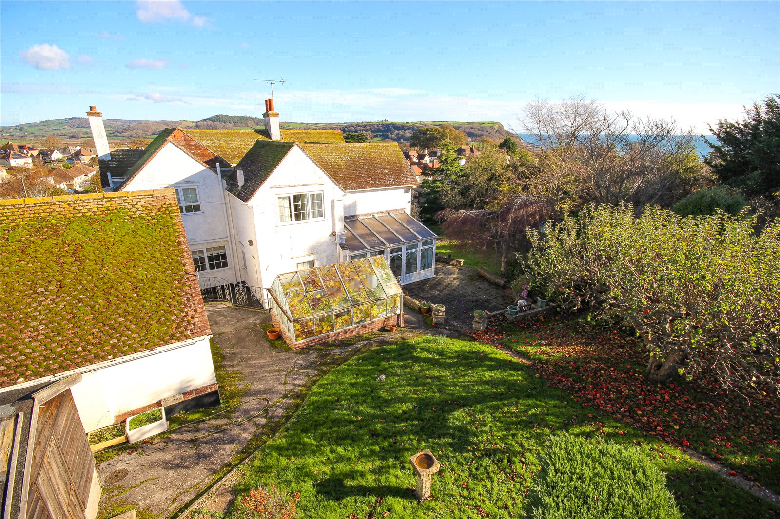 From the conservatory, a large, paved terrace provides an excellent seating and entertaining area with steps leading up to the principal section of the garden. This extensive area includes a greenhouse, a large shed, with numerous apple trees, mature hedging and fenced boundaries with a five-bar gate at the top providing secondary access onto Durley Road. This garden enjoys far-reaching views looking out towards Axmouth and the surrounding countryside.