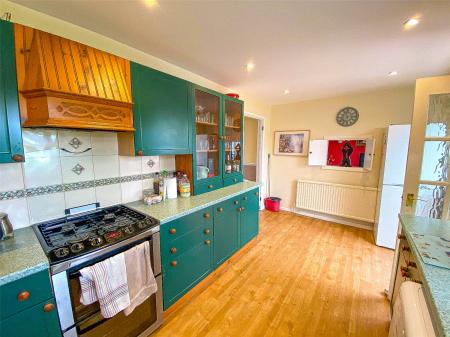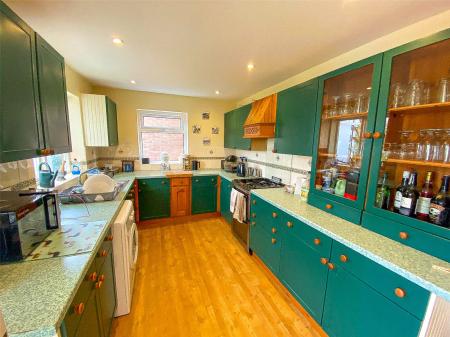 The kitchen/breakfast room is fully fitted with a range of wood effect teal base and wall units, worktops and tiled splashback with sink; alongside space/plumbing for a washing machine/dishwasher, freestanding cooker and freestanding fridge freezer. A door also leads out to the conservatory from the kitchen.
