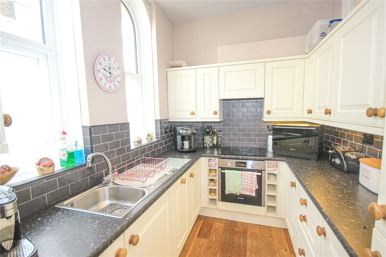 The living room is a bright and sizeable room with a high ceiling and large windows spanning one side. There is space for a dining area with a central electric Dimplex fireplace. An internal door leads into the fully fitted kitchen which is fully fitted with a range of cream shaker style base and wall units with laminate worktops, sink, integrated slimline dishwasher, integrated oven with induction ceramic hob over and integrated fridge freezer. The gas central heating combination boiler is also situated in the kitchen