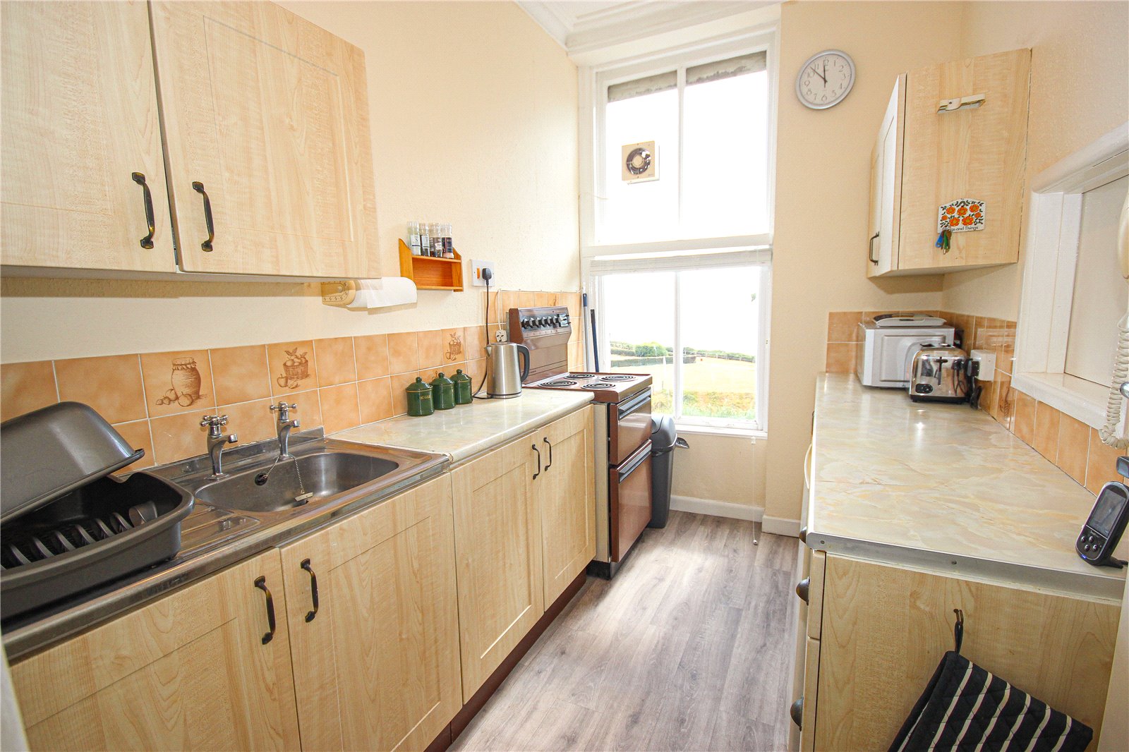 The Galley style kitchen has a matching range of base and wall units with space for undercounter appliances. A sash window enjoys the same views as the living room.