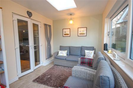 French doors open to the rear sunroom extension with sliding windows and French doors leading out to the garden and a lantern roof light. A separate door from the kitchen leads to the converted garage which now provides a separate study with picture window to front and utility room. The utility room has a further span of units with sink, space for a washing machine and tumble dryer, a wall mounted gas central heating boiler, shelving and space for an American style fridge/freezer. A door leads to the rear garden.