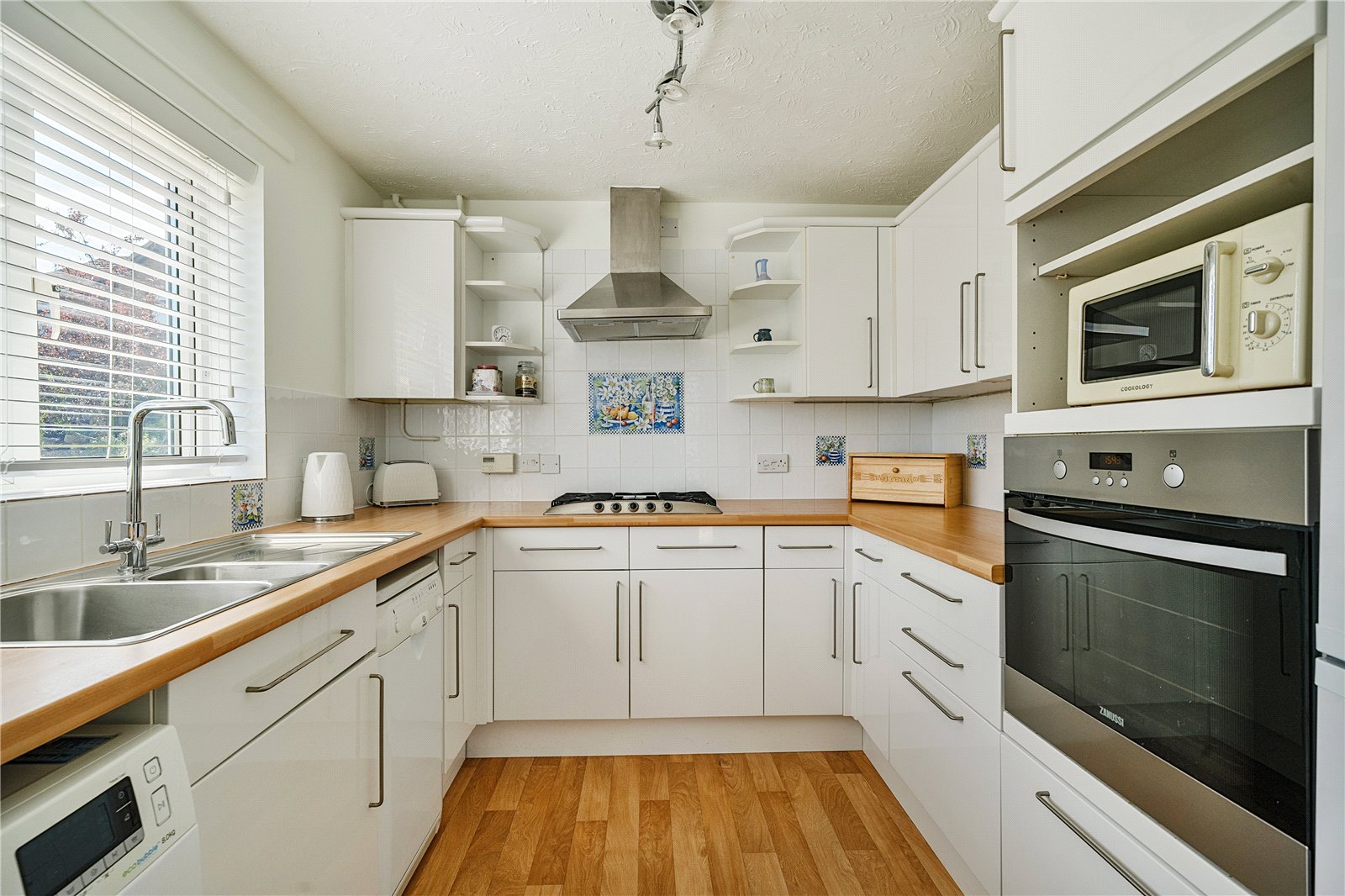 The front door provides access to an inner hallway, with large cloakroom cupboard and an opening into the kitchen. The kitchen has a range of matching white gloss base and wall units, laminate worktops and sink and houses the gas fired central heating boiler. There is space/plumbing for a washing machine, slimline dishwasher and tall fridge freezer, alongside an integrated five burner gas hob with extractor over and integrated electric oven.