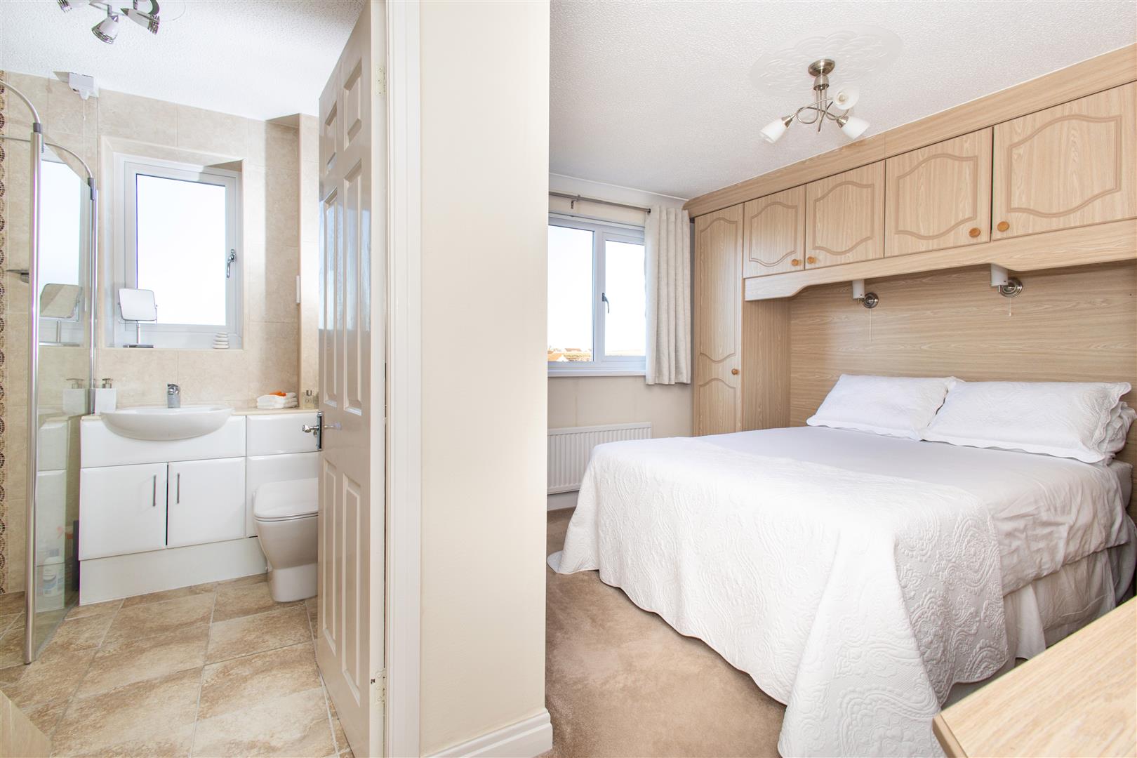 En-Suite - Fully tiled walls and floor with a wet room design having walk-in shower, vanity housed wash hand basin and unit housed push flush WC. PVCu double glazed frosted window, chrome central heated towel warmer, PVCu double glazed frosted window and shaver point.