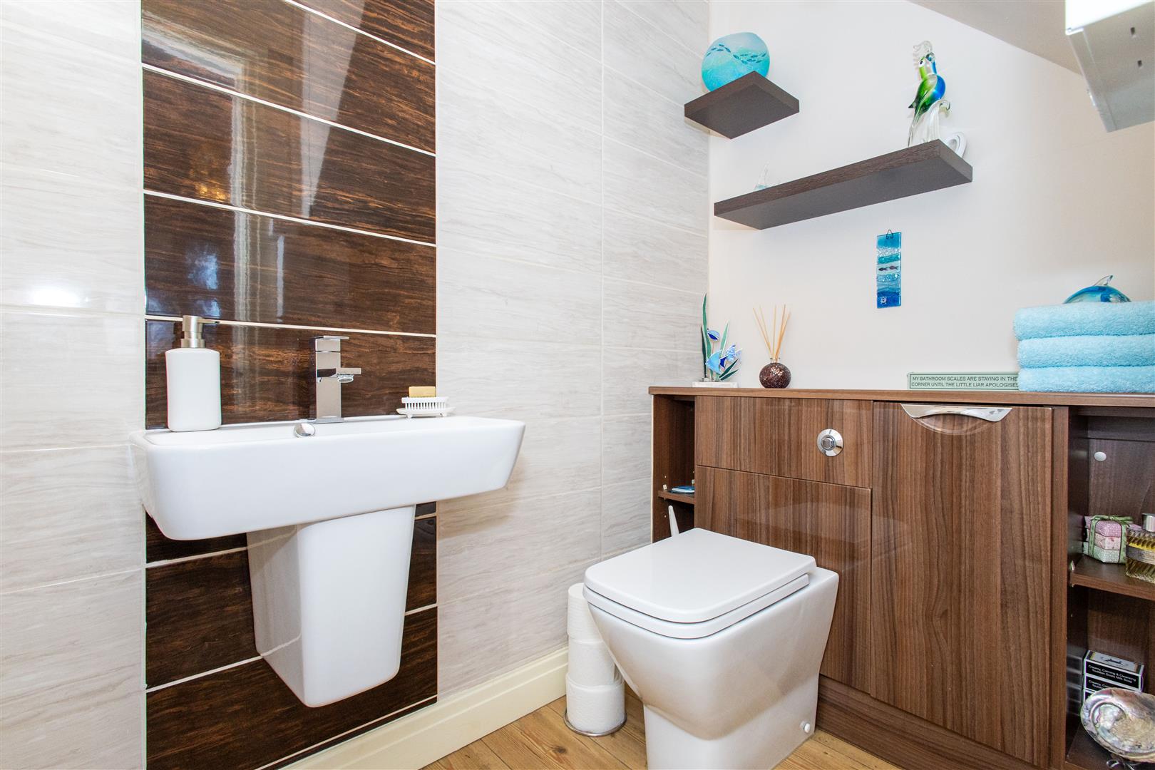 Wc - Comprising a contemporary suite with tiled wall, half pedestal wash hand basin and unit housed push flush WC. Extractor fan, chrome central heated towel warmer and laminate flooring.