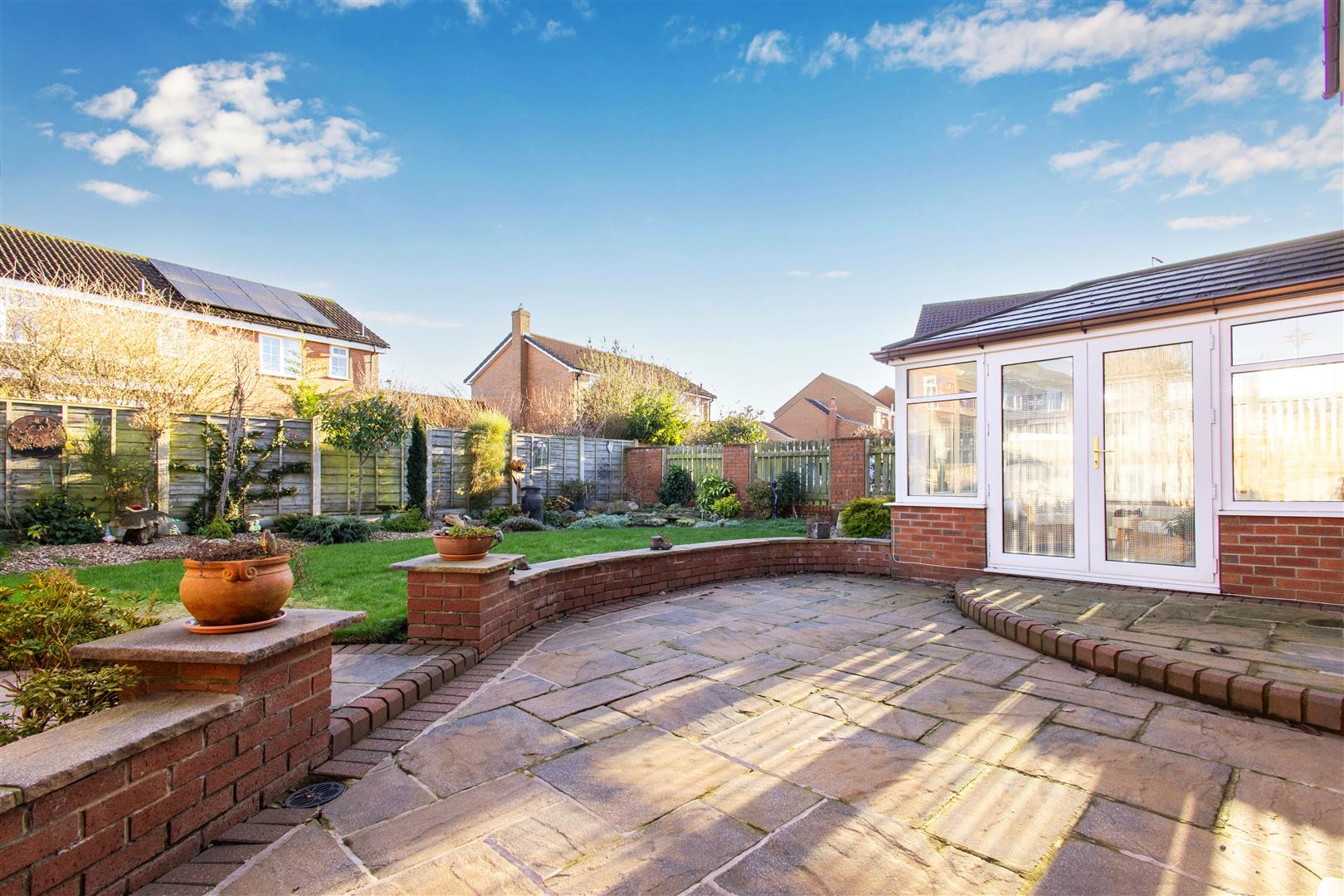 Exterior - Set in a tucked away position with large sweeping tarmac drive accessing the double garage with electric door. The rear garden is well enclosed and landscaped with flagged patio, lawn and sheltered seating area which is also flagged.