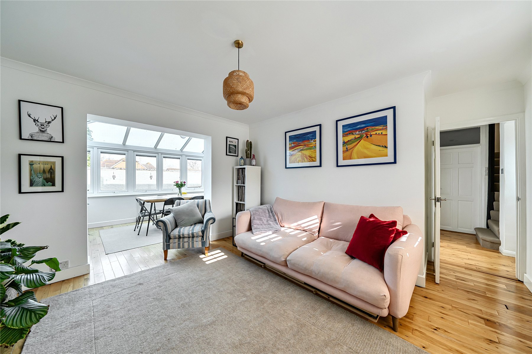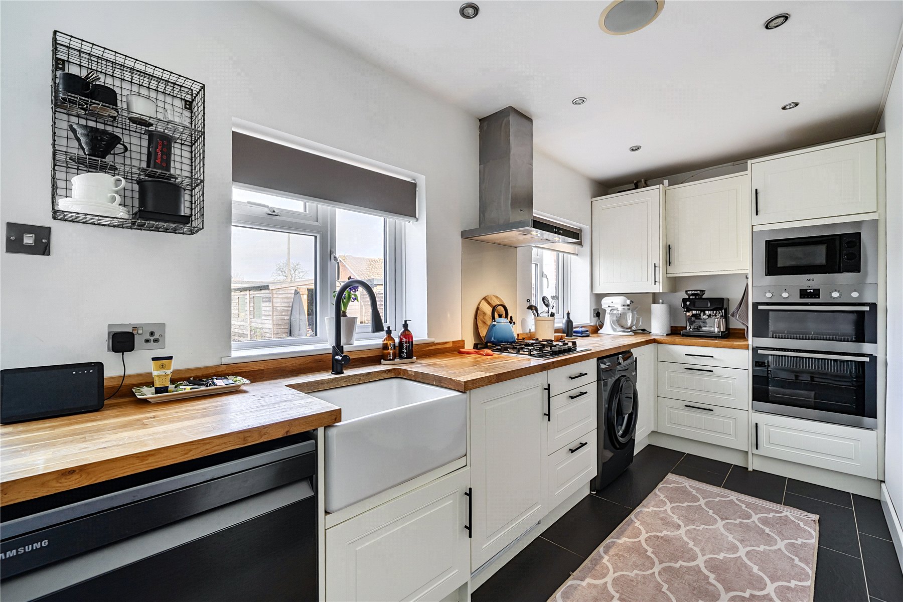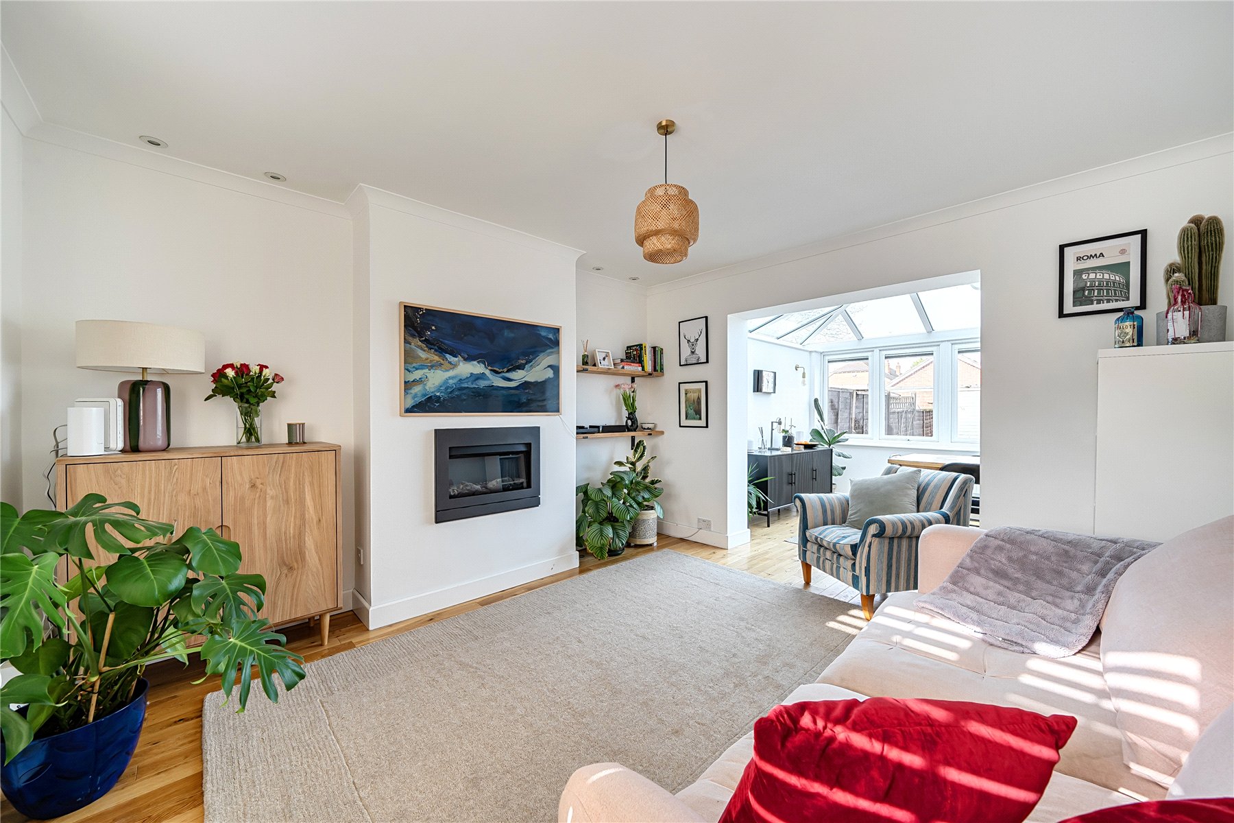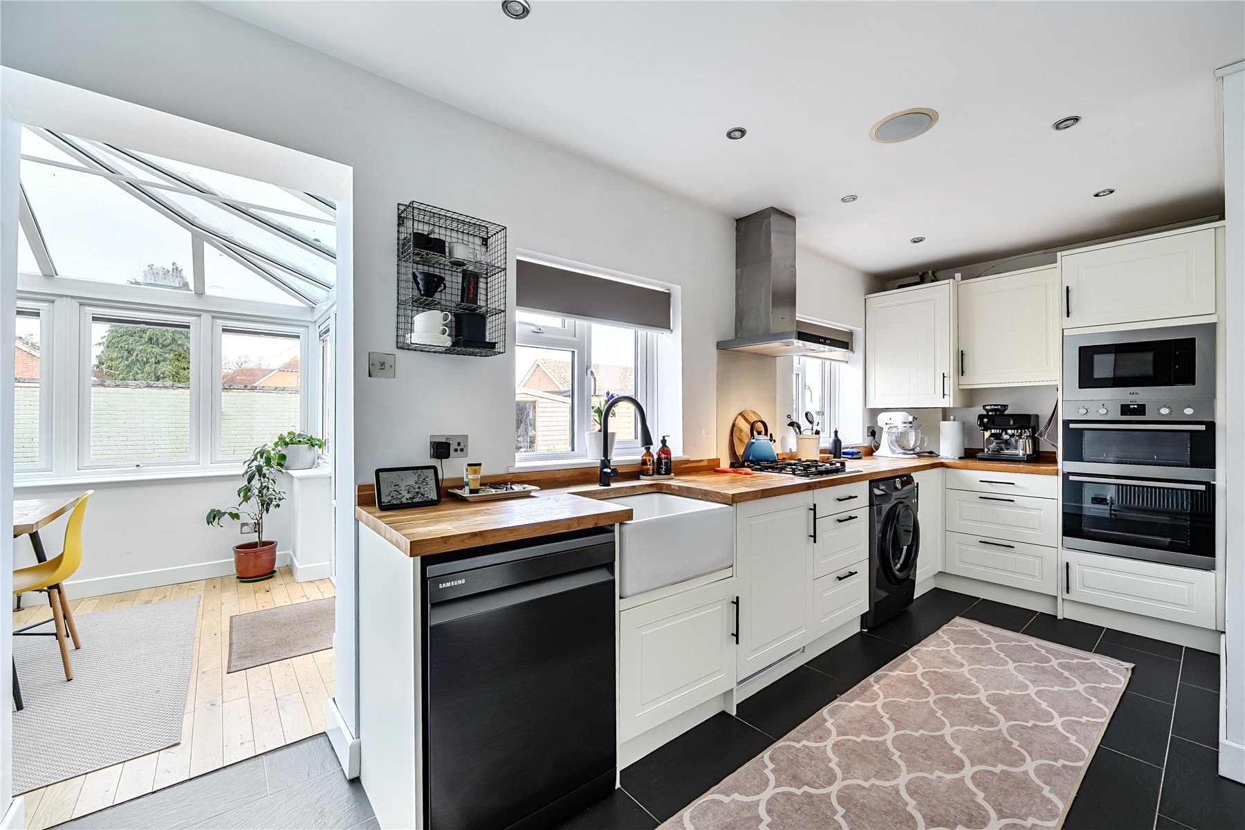 The entrance hall features wooden flooring and leads to the ground floor accommodation, where a generously sized sitting room is positioned at the front of the property. This contemporary room features a stylish, wall-mounted fireplace and an flows through to the conservatory, maintaining a sense of openness while clearly distinguishing the two areas. Filled with natural light, the conservatory provides a delightful dining area, complete with French doors that lead out to the garden. The well-planned kitchen is fitted with a generous range of shaker style units with solid wood work surfaces, and includes a butler sink and a selection of integral appliances. The modern family bathroom completes the ground floor accommodation.