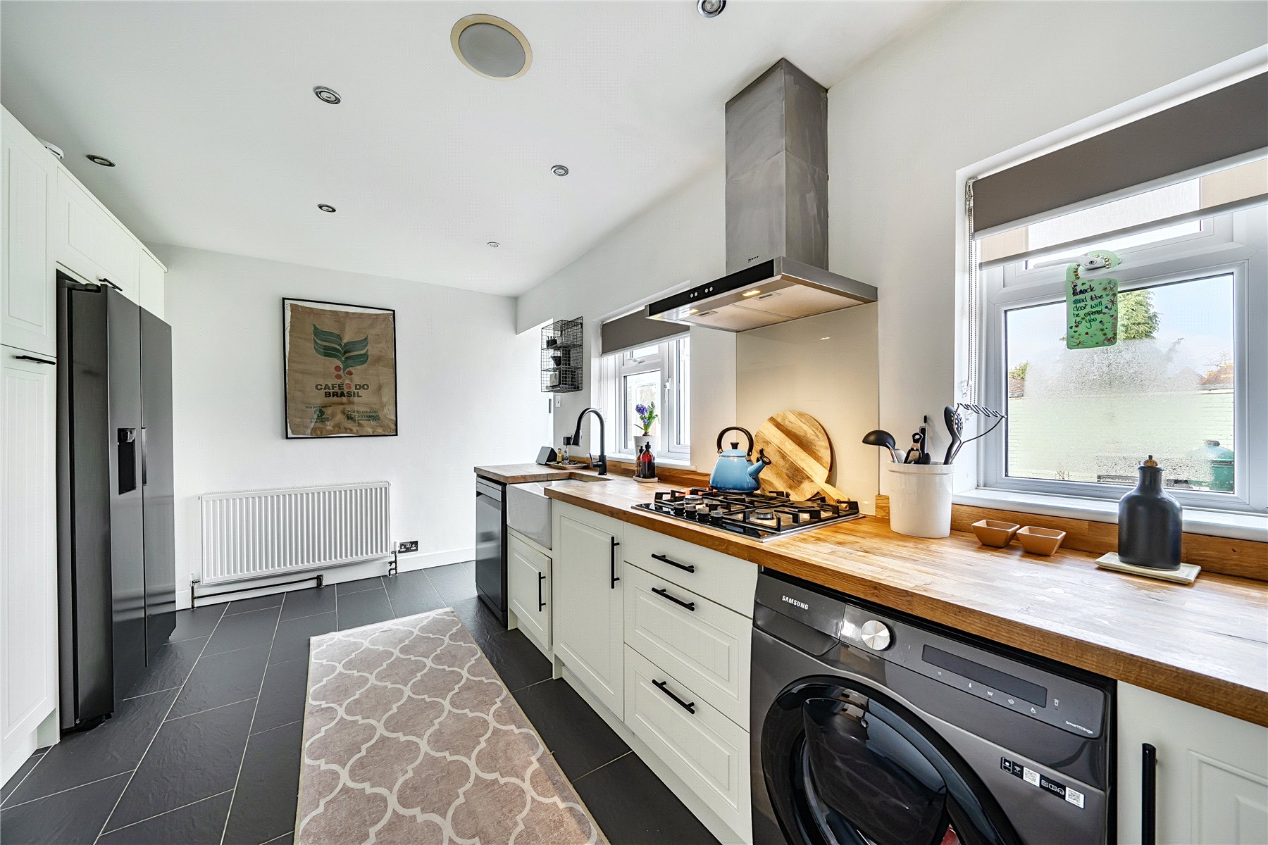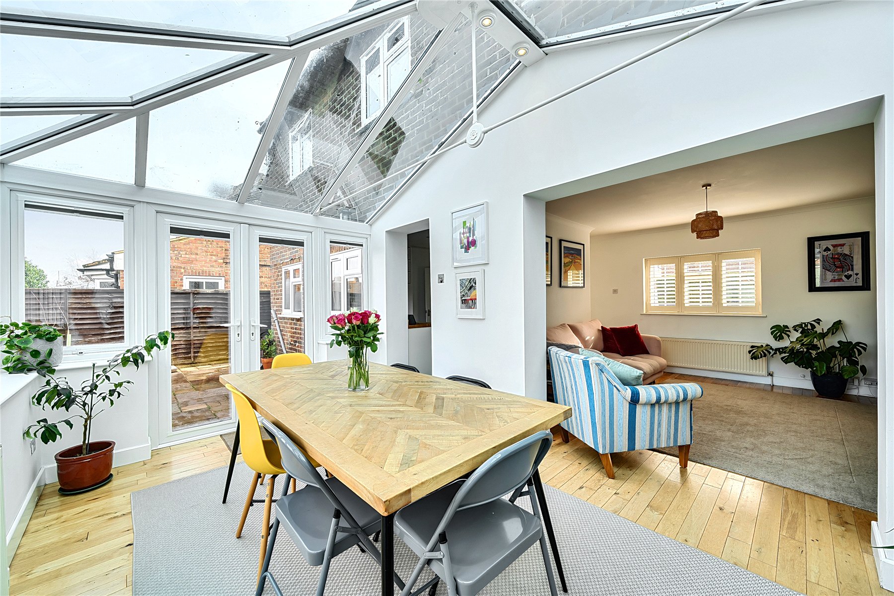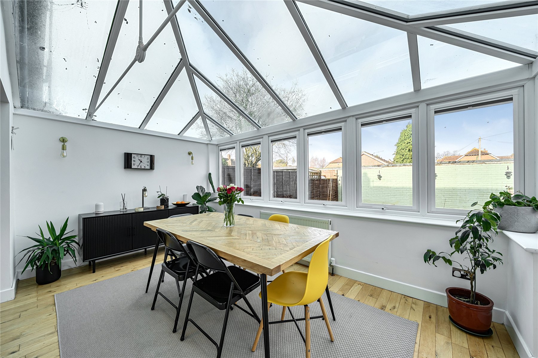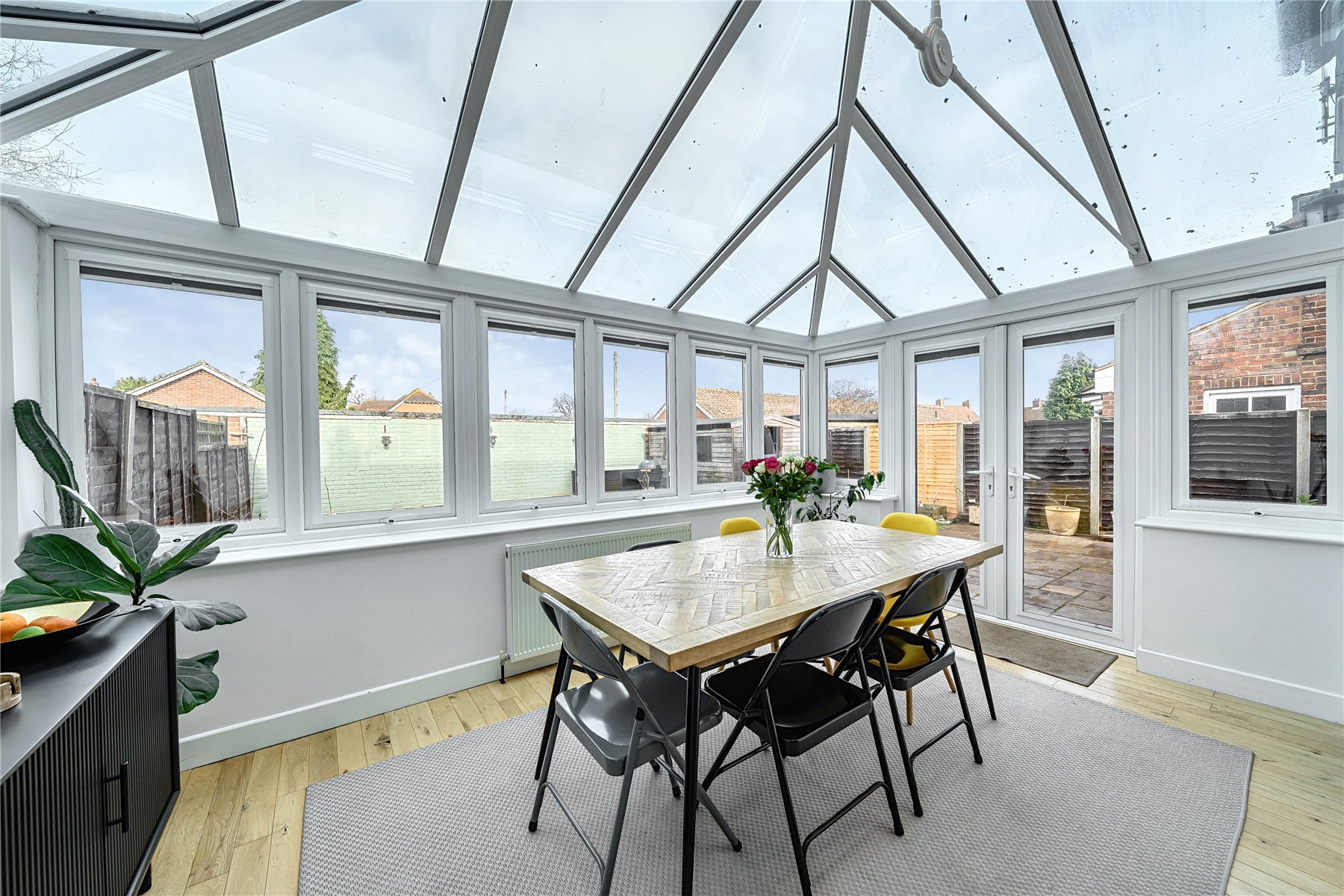 The entrance hall features wooden flooring and leads to the ground floor accommodation, where a generously sized sitting room is positioned at the front of the property. This contemporary room features a stylish, wall-mounted fireplace and an flows through to the conservatory, maintaining a sense of openness while clearly distinguishing the two areas. Filled with natural light, the conservatory provides a delightful dining area, complete with French doors that lead out to the garden. The well-planned kitchen is fitted with a generous range of shaker style units with solid wood work surfaces, and includes a butler sink and a selection of integral appliances. The modern family bathroom completes the ground floor accommodation.