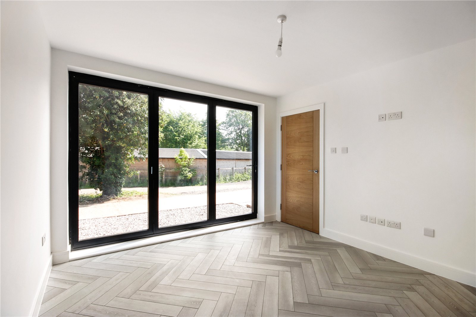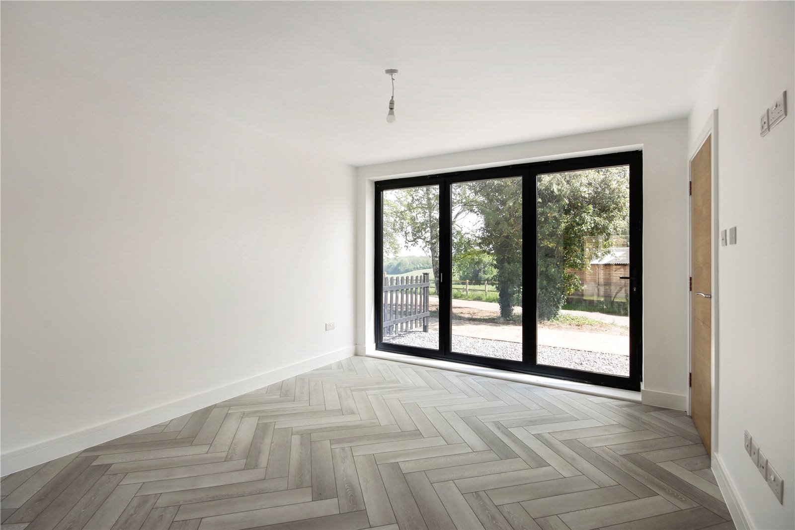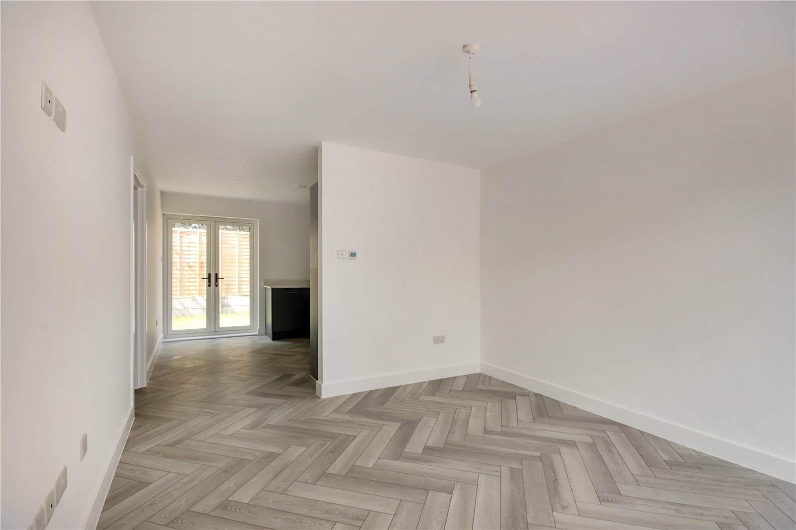 Living Room 11'10" x 11' (3.6m x 3.35m). Bi-fold double glazed door to front. Wood effect flooring with underfloor heating. Plain ceiling. Open plan to kitchen.